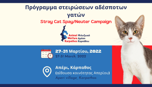 Η Φιλοζωική Δράση Καρπάθου – Animal Welfare Karpathos ανακοινώνει πρόγραμμα στειρώσεων αδέσποτων γατών που θα διεξαχθεί μεταξύ 27-31 Μαρτίου, 2022 στην αίθουσα της κοινότητας Απερίου. Το πρόγραμμα και η άσκηση …