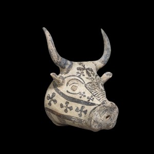 Πήλινο αγγείο που χρησιμοποιούταν σε θρησκευτικές τελετές, με μια μεγάλη οπή στο πίσω μέρος της κεφαλής του ταύρου και μια μικρότερη στο ρύγχος.
