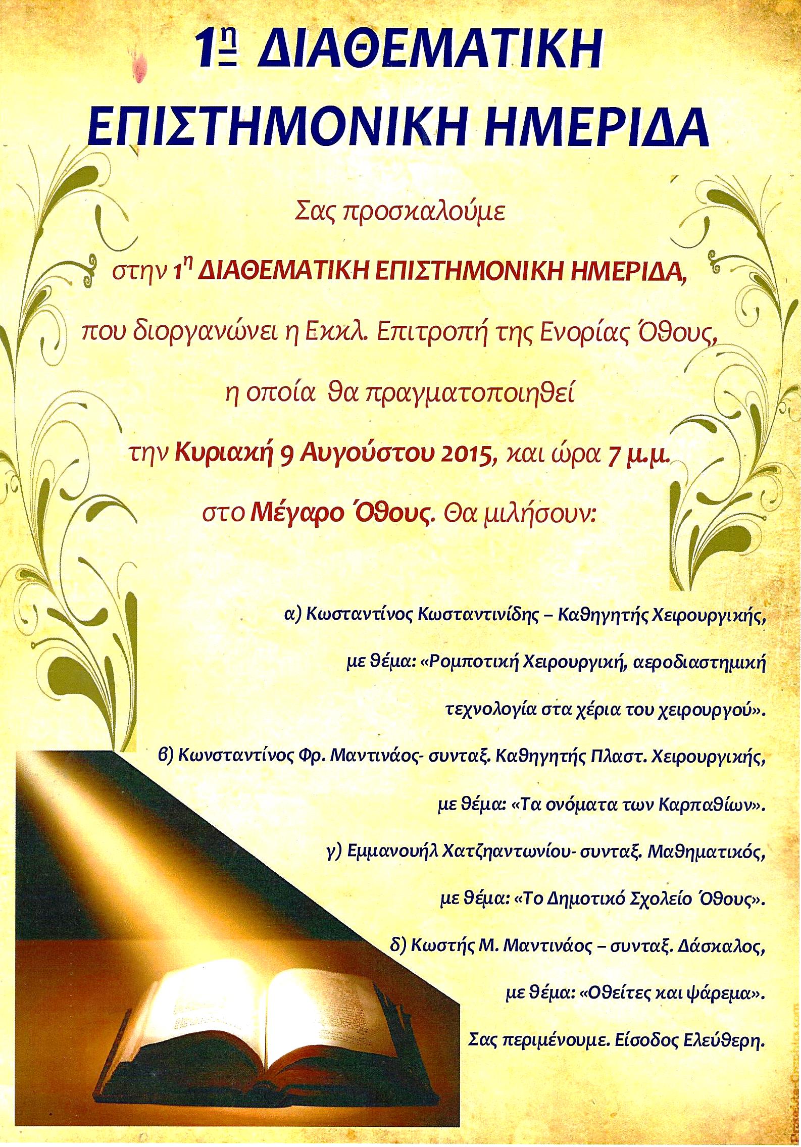 Την Κυριακή 9 Αυγούστου 2015, στίς 7μ.μ. στο κατάμεστο απο κόσμο Μέγαρο του Όθους, πραγματοποιήθηκε με τεράστια επιτυχία, η 1η Επιστημονική Διαθεματική Ημερίδα. Την πρωτοβουλία και την ευθύνη της διοργάνωσης είχε η Εκκλησιαστική Επιτροπή της Ενορίας Όθους. Την παρουσίαση της εκδήλωσης έκανε ο εφημέριος Όθους, και Ιεροκύρηξ της Ιεράς Μητροπόλεως, Αρχιμανδρίτης π. Μιλτιάδης Μίτσελλ. Συμμετείχαν 4 εισηγητές, οι οποίοι ανέπτυξαν ενδελεχώς τα αντίστοιχα θέματα.