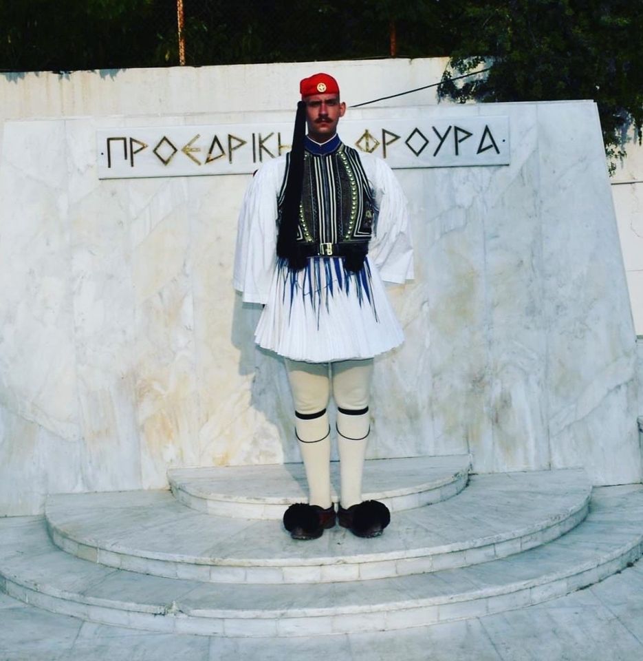 Φόρεσε με περηφάνεια τη στολή του εύζωνα και υπηρέτησε, για εννέα μήνες, στην Προεδρική Φρουρά, φυλάττοντας τιμητικά τον θεσμό της Δημοκρατίας. Έζησε την αυστηρή καθημερινότητα των ευζώνων, βάδισε αναρίθμητες φορές στο λευκό μονοπάτι -σύμβολο του δρόμου προς τους απελευθερωτικούς αγώνες- από το στρατόπεδο προς το Μνημείο του Άγνωστου Στρατιώτη, παρέστη στην έπαρση και στην υποστολή της σημαίας στο Βράχο της Ακρόπολης, βίωσε σε όλη του την ένταση τον συμβολισμό που εκπέμπει το ύψιστο τιμητικό άγημα της χώρας.