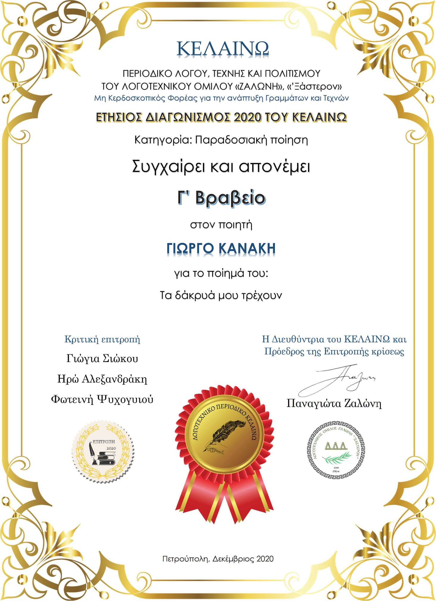 Με το ποίημα “ΤΑ ΔΑΚΡΥΑ ΜΟΥ ΤΡΕΧΟΥΝ” ο Γιώργος Ν. Κανάκης έλαβε μέρος στον Ετήσιο Λογοτεχνικό Διαγωνισμό του «ΚΕΛΑΙΝΩ». Περιοδικό Λόγου,Τέχνης και Πολιτισμού του Λογοτεχνικού Ομίλου «ΖΑΛΩΝΗ». «’Ξάστερον»,για το 2020 και απέσπασε το Γ΄ Βραβείο ποίησης.