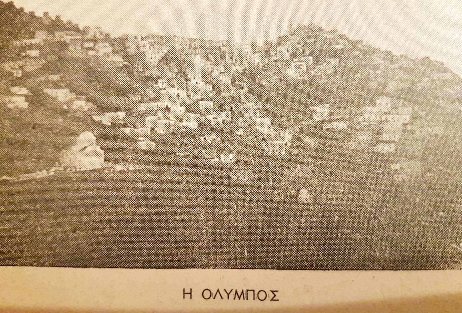 Η Όλυμπος δεν είναι μόνον η μεγαλυτέρα κωμόπολις της νήσου μας, αλλά και η πλέον ένδοξος εις την ιστορίαν της Καρπάθου, την οποίαν επιμαρτυρούν τα ιστορικά μνημεία της Βρυκούντος, της Αυλώνας, και των Παλατίων της Σαρίας (δια τα οποία θα έπρεπε να ασχοληθώσιν επιτοπίως ειδικοί αρχαιολόγοι ).