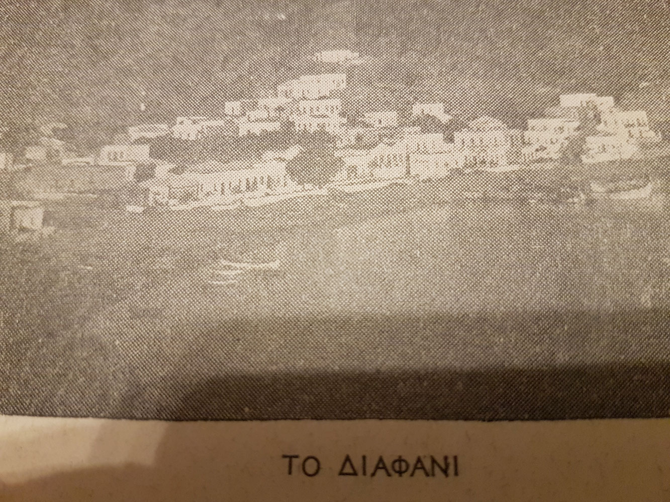 Αλλ’ όταν μετ’ ολίγον ξεκινήσαμεν και πάλιν πλησιάζοντες προς τον Άγιον Ιωάννην, τον Άγιον Μηνάν, την κοιλάδα Φόρες, και υπό διαρκή τρικυμίαν πάντοτε πλευρίζομεν αισίως την 11ην μεσονύκτιον εις τον προβλήτα του Διαφανίου, όπου ο φιλόξενος καφενές του κ. Νικολού Πρωτόπαπα ηνοίχθη αμέσως δια να μας προφέρει τους ευεργετικωτάτους καφέδες του. Μετά αναπαυτικώτατον ύπνον εις την οικία του κ. Κόνσολα, εξυπνήσαμεν λίαν πρωί και εθαυμάσαμεν την δημιουργίαν του Διαφανίου.
