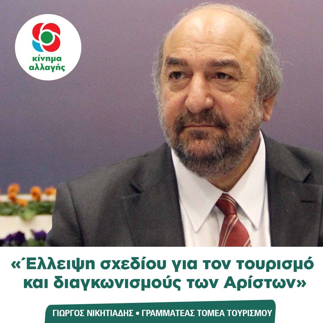 Με αφορμή την απόρριψη από την Ν.Δ της τροπολογίας για μείωση των συντελεστών ΦΠΑ στα νησιά που κατέθεσε το Κίνημα Αλλαγής στη Βουλή, ο τ. Υφυπουργός Πολιτισμού-Τουρισμού και Γραμματέας του Τομέα Τουρισμού του κόμματος Γ. Νικητιάδης, προέβη στην ακόλουθη δήλωση: