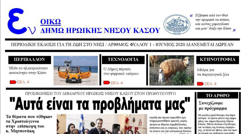 Για την ενημέρωση των πολιτών η Δημοτική Αρχή προκειμένου να δημιουργήσει ένα δίαυλο επικοινωνίας με όλους τους Κασιώτες αλλά και τους φίλους της Η.Ν. Κάσου απ’ όλα τα μέρη της γης, προχώρησε στην έκδοση εντύπου δημοτικής εφημερίδας με τίτλο «Τα εν οίκω εν Δήμω της Ηρωικής νήσου Κάσου» με στόχο να εκμηδενίσει τις αποστάσεις.