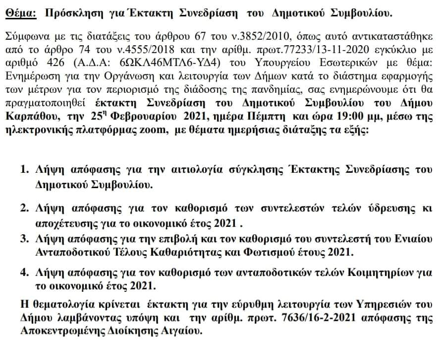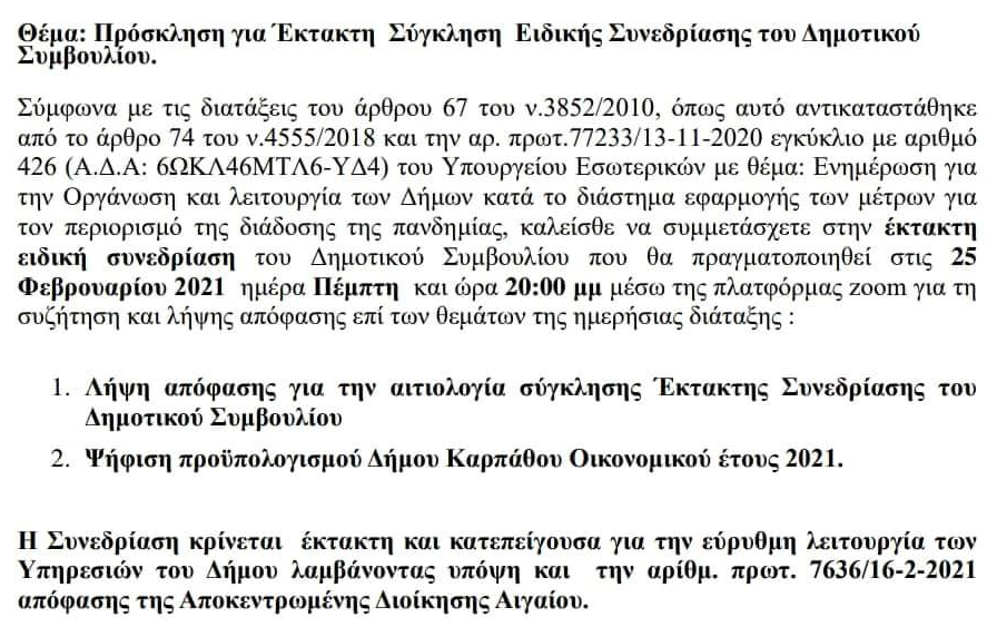 Πρόσκληση έκτακτης Συνεδρίασης του Δημοτικού Συμβουλίου την Πέμπτη 25/2/2021 και ώρα 19:00 και 20:00