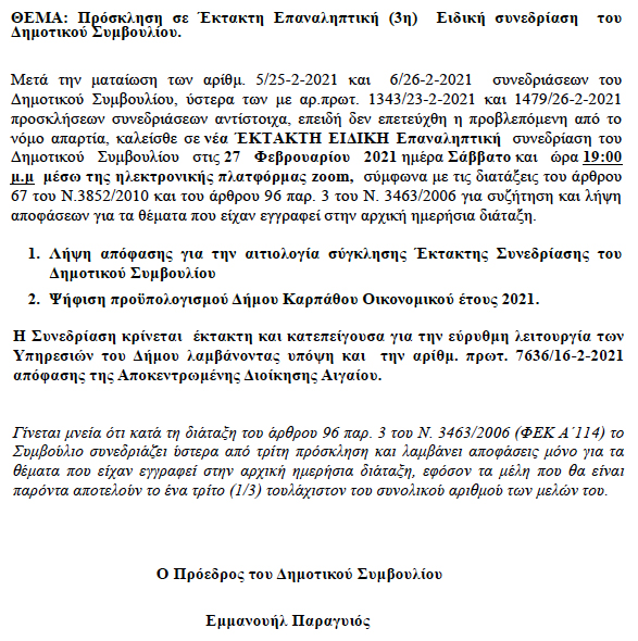 Νέα έκτακτη επαναληπτική συνεδρίαση του Δημοτικού Συμβουλίου Καρπάθου, σήμερα, Σάββατο 27/2/2021 και ώρα 19.00.