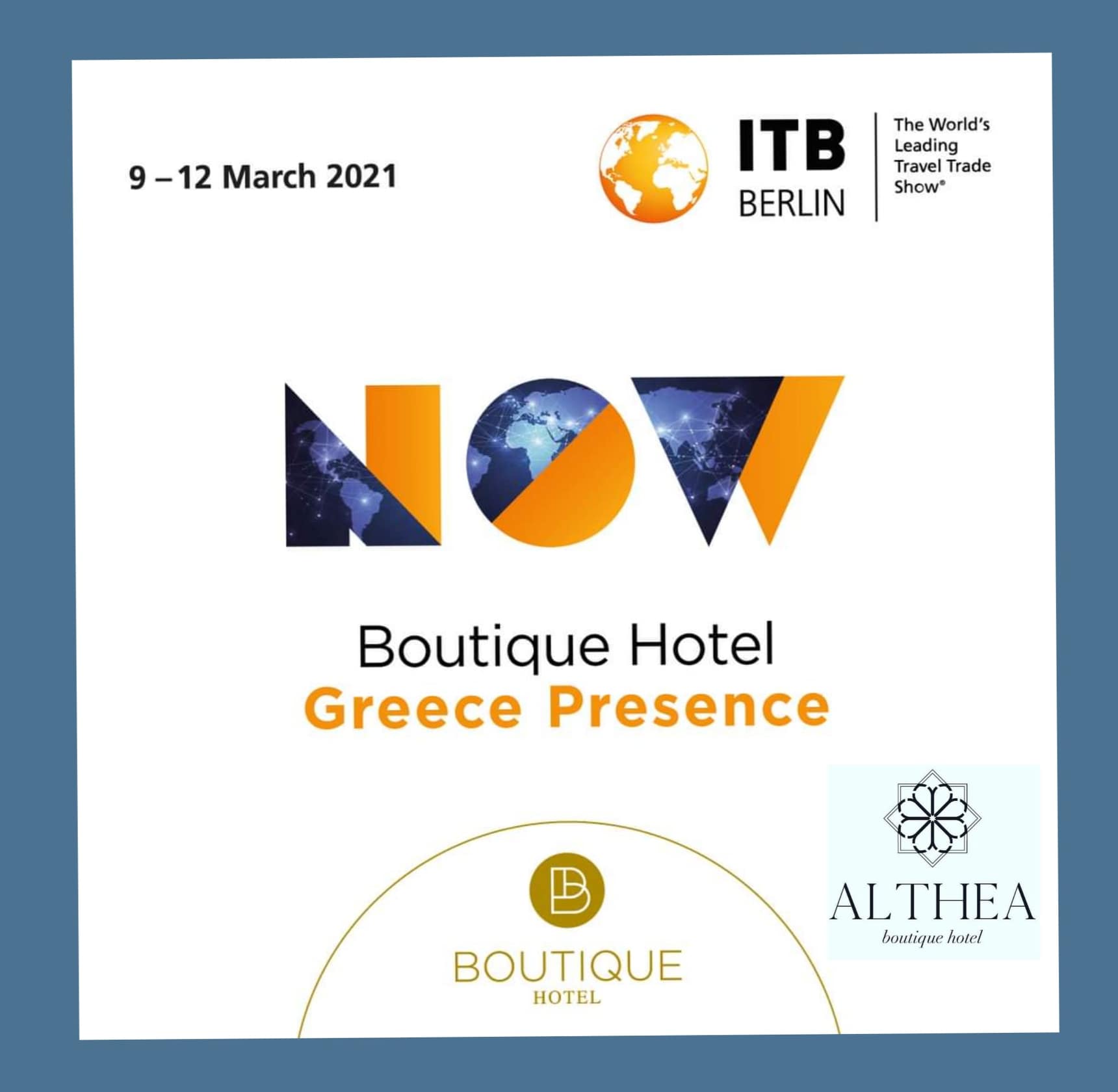 Είχαμε την τιμή να παρουσιάσουμε το ξενοδοχείο μας Althea Boutique Hotel στην έκθεση ITB Berlin με τα πιστοποιημένα και μοναδικά ξενοδοχεία που φέρουν την “σφραγίδα” Boutique Hotel” του Ξενοδοχειακού Επιμελητηρίου Ελλάδος.