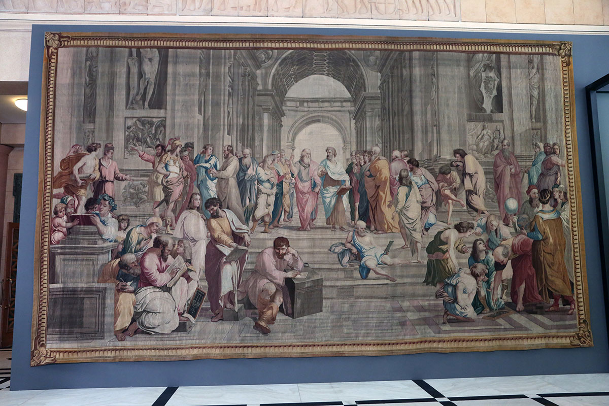 Αυτή η παράσταση των Ελλήνων φιλοσόφων, που κοσμεί την επίσημη κατοικία του Προέδρου της Γαλλικής Εθνοσυνελεύσεως, αλλά και τη Γαλλική Εθνοσυνέλευση, πρωτογενώς βρίσκεται ως νωπογραφία στο Βατικανό. Είναι έργο του σπουδαίου ζωγράφου της Αναγέννησης Ραφαήλ. Η όλη ιδέα την περίοδο της Αναγέννησης να κοσμήσουν το παλάτι του Βατικανού με αρχαίους Έλληνες φιλοσόφους σχετίζεται με την αντίληψη της εποχής εκείνης ότι η χριστιανική διδασκαλία ήταν σε πλήρη αρμονία με την αρχαία ελληνική φιλοσοφία. Αυτό ήταν το πνεύμα των μορφωμένων ανθρώπων της εποχής της Αναγέννησης.Η Γαλλική Εθνοσυνέλευση φιλοξενεί αυτόν τον πίνακα για να δείξει ότι φιλοδοξεί, όπως κάθε Κοινοβούλιο θα φιλοδοξούσε, οι αποφάσεις που παίρνονται να είναι υπό την αιγίδα τέτοιων σπουδαίων πνευμάτων, όπως οι αρχαίοι Έλληνες φιλόσοφοι.