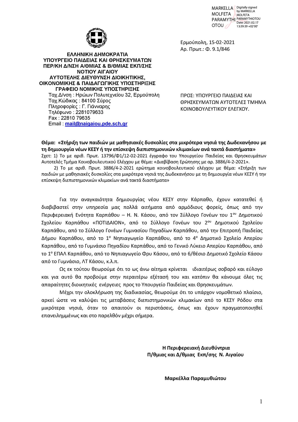 «Το Υπουργείο Παιδείας αντιμετωπίζει θετικά την πρόταση για τη δημιουργία Κέντρου Εκπαιδευτικής και Συμβουλευτικής Υποστήριξης στην Κάρπαθο για να εξυπηρετεί τα παιδιά με μαθησιακές δυσκολίες, που διαμένουν στο νησί αλλά και στην Κάσο.