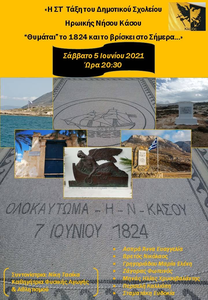 Στα πλαίσια των επετειακών εκδηλώσεων του Δήμου της Ηρωϊκής Νήσου Κάσου για τα 197 χρόνια του Ολοκαυτώματος, η ΣΤ΄ τάξη του Δημοτικού Σχολείου “θυμάται” το 1824 και το βρίσκει στο Σήμερα.