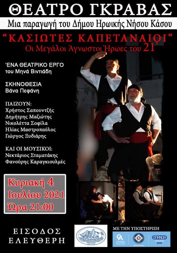 Το θεατρικό κείμενο αναδεικνύει τη σημαντική προσφορά των καπεταναίων της Κάσου στον μεγάλο αγώνα της Ελληνικής Επανάστασης. Ο Μάρκος Μαλλιαράκης, ο Θόδωρος Κανταρτζής, ο Νικόλαος Γιούλιος ή Μπουρέκας, ο Κώστας Αρβανιτόπουλος και οι άλλοι ήρωες της Κάσου «ζωντανεύουν» επί σκηνής την Κυριακή στις 9 μ. μ. στο υπαίθριο Θέατρο Γκράβας, με οικοδεσπότη τον Οργανισμό Πολιτισμού Νεολαίας και Άθλησης του Δήμου Αθηναίων.