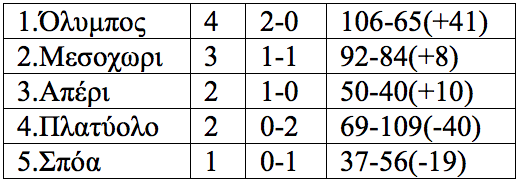 ΟΛΥΜΠΟΣ (Βασίλας): Χηράκης 3(1), Χατζήπαπας Ε. 15(3), Πρωτόπαπας Β. 10, Αρβανιτάκης 2, Χατζήπαπας Κ. 3, Γκιζέλης 15(3), Πρωτόπαπας Ν. 5, Παπαδημητρίου 6.