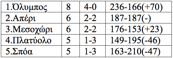 Η Όλυμπος επικράτησε άνετα των Σπόων (66-41), έκανε το 4 στα 4 και άφησε εκτός ημιτελικών τους αντίπαλους της, ενώ ως τέταρτο προκρίθηκε το Πλατύολο, που εξέτισε το ρεπό του. Αύριο, θα διεξαχθούν οι ημιτελικοί Όλυμπος- Πλατύολο (18:30) και Απέρι- Μεσοχώρι (20:30), ενώ την Παρασκευή ο τελικός για την ανάδειξη της νικήτριας ομάδας.