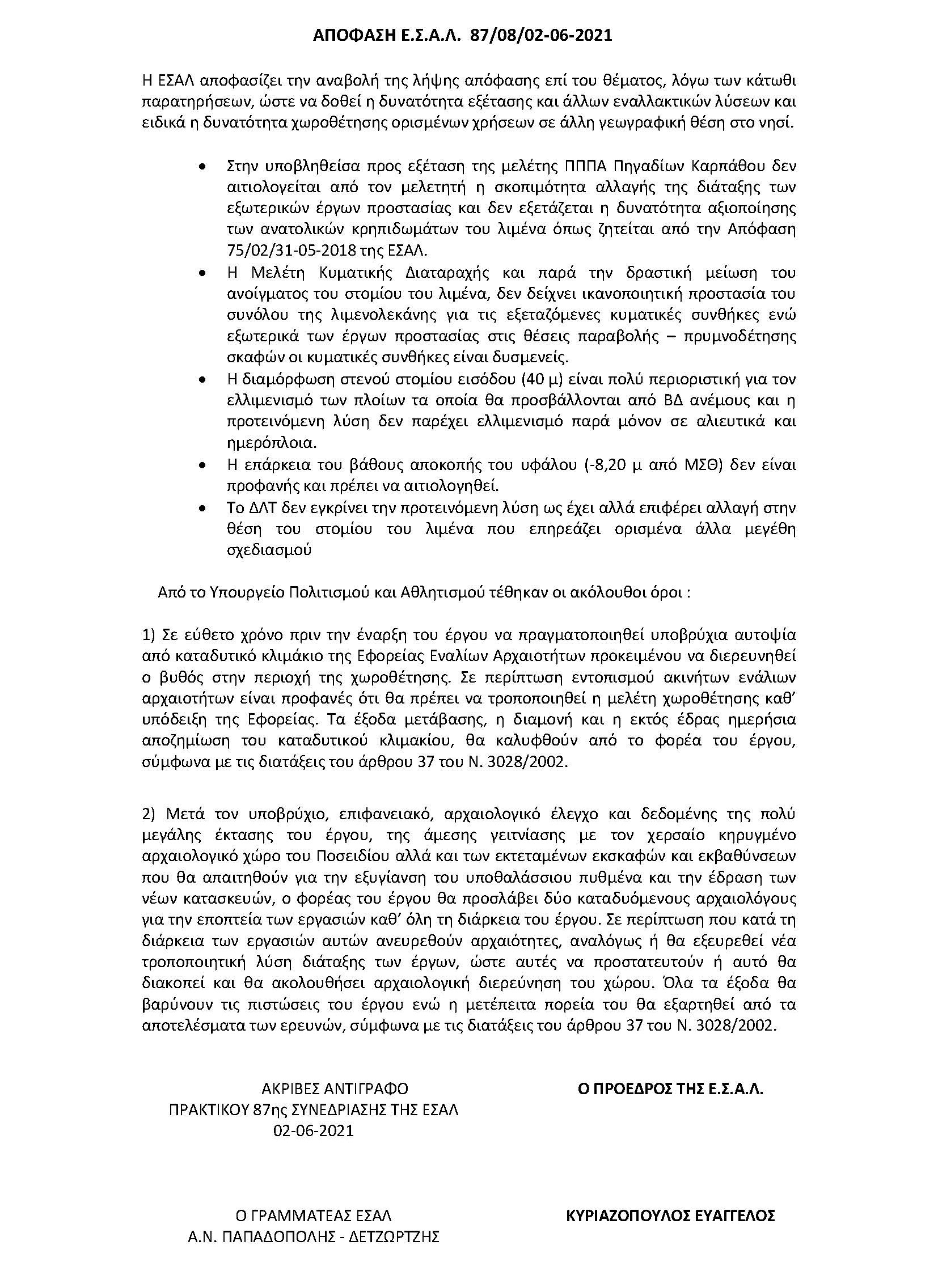 Αναρτήθηκε στην διαύγεια με ΑΔΑ:9ΜΟΑ4653ΠΩ-ΗΛΚ η απόφαση της ΕΣΑΛ για την μελέτη επέκτασης του λιμένα Καρπάθου, με την οποία αναβάλλεται η λήψη απόφασης «για να δοθεί η δυνατότητας εξέτασης και άλλων εναλλακτικών λύσεων και ειδικά η δυνατότητας χωροθέτησης ορισμένων χρήσεων σε άλλη γεωγραφική θέση στο νησί».