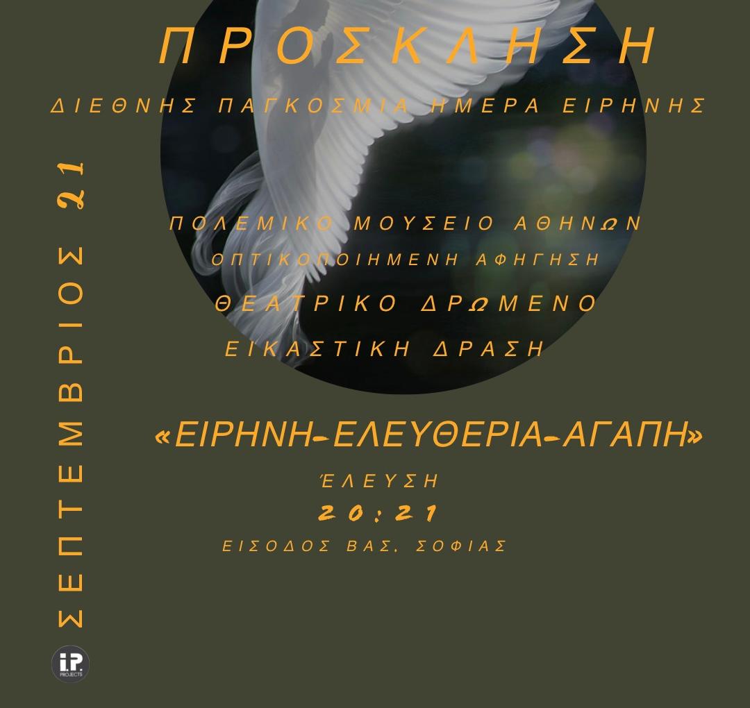 Καταξιωμένοι καλλιτέχνες από όλους τους χώρους της Τέχνης, ηθοποιοί, τραγουδοποιοί, εικαστικοί, σχεδιαστές αλλά και δημοσιογράφοι, θα γίνουν ένα και θα γιορτάσουν με όλους εμάς την Παγκόσμια Ημέρα Ειρήνης, την Τρίτη 21 Σεπτεμβρίου στον εξωτερικό χώρο του Πολεμικού Μουσείου Αθηνών, ο οποίος θα φωτιστεί για πρώτη φορά με 3d mapping, που επιμελήθηκε ο γνωστός σκηνοθέτης, Αντώνης Σωτηρόπουλος.