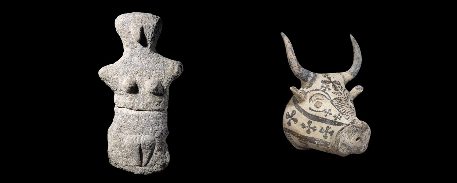 Ritual sprinklers or libation (liquid offering) vessels were frequently made in the shape of animals heads with small holes in the mouth to allow the liquid to escape. The bull’s head is the most popular form. Bull-head rhyta are also known in other materials, most famously the one carved from serpentine from the Little Palace at Knossos and the example in silver from Shaft Grave IV at Mycenae, both of which had gilded horns.