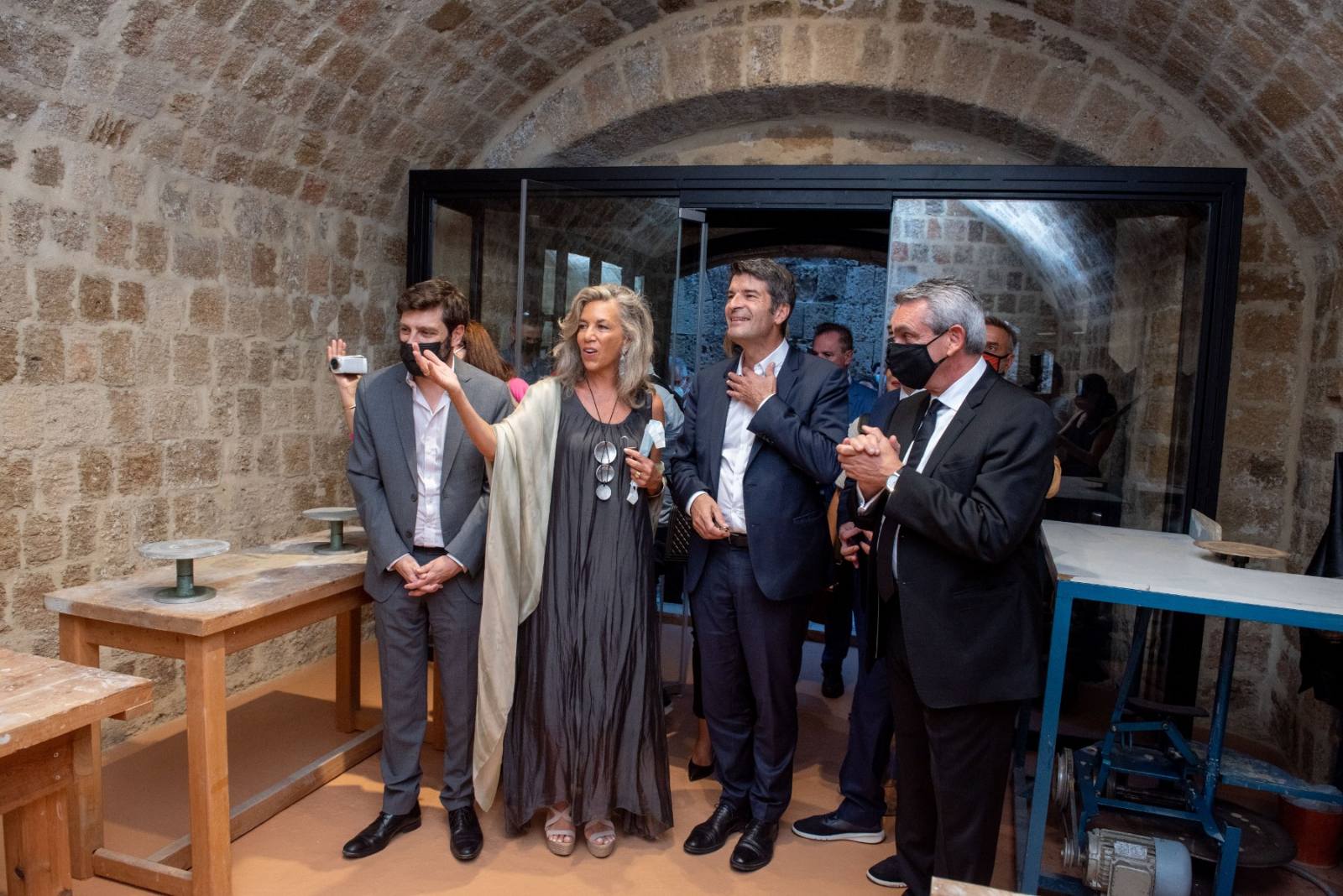 Στα εγκαίνια, τα οποία έγιναν με περιορισμένη συμμετοχή λόγω των υγειονομικών μέτρων, παρέστησαν ο Πρέσβης της Γαλλίας στην Ελλάδα, Patrick Maisonave, ο Υφυπουργός Πολιτισμού, Νικόλας Γιατρομανωλάκης, ο Δήμαρχος Ρόδου, Αντώνης Καμπουράκης, η επίτιμη Πρόξενος της Γαλλίας στη Ρόδο, Αλίκη Μοσχή- Gauguet, η οποία είχε την πρωτοβουλία δημιουργίας του εργαστηρίου, ο Γενικός Πρόξενος της Τουρκίας, Mehmet Αtif Sekercioglu, η επίτιμη Πρόξενος της Αυστρίας, Μαίρη Μοσχή-Στάθη, ο Διευθυντής του Γαλλικού Ινστιτούτου Ελλάδος, Nicolas Eybalin, η Μορφωτική Ακόλουθος της Γαλλικής Πρεσβείας στην Αθήνα, Nadia Sartawi, η αναπληρώτρια Μορφωτική Ακόλουθος του Γαλλικού Ινστιτούτου. Δ. Μίχου, ο Εντεταλμένος Τουρισμού Δωδεκανήσου, Κώστας Χρυσοχοΐδης, η Προϊσταμένη Εφορείας Αρχαιοτήτων Δωδεκανήσου, Μάνια Μιχαηλίδου, ο εκπρόσωπος του Στρατηγού, Διοικητού 95 ΑΔΤΕ, Χρήστος Κυρατσάκης, ο Διοικητής Τροχαίας Ρόδου, Γιώργος Στέργου, ο τέως Υπουργός, Αριστοτέλης Παυλίδης, ο τέως νομάρχης Δωδεκανήσου, Σάββας Καραγιάννης, ο Πρόεδρος του Επιμελητηρίου Δωδεκανήσου, Γιάννης Πάππου, ο Πρόεδρος του ΤΕΕ Δωδεκανήσου, Αντώνης Γαννικουρής, ο Προϊστάμενος της Περιφερειακής Υπηρεσίας Τουρισμού Δωδεκανήσου, Αγαπητός Ξάνθης, η Πρόεδρος του Ροταριανού Ομίλου Ρόδος – Κολοσσός Έλενα Γιαννίκη, η Πρόεδρος Εικαστικών Δωδεκανήσου, Σταματία Στεργενάκη, η Πρόεδρος του Συλλόγου Διευθυντών Ξενοδοχείων Ρόδου, Γιώργος Ματσίγκος, ο Γιώργος Διακοσάββας, συγγραφέας, ο οποίος έδωσε το φωτογραφικό υλικό της έκθεσης.
