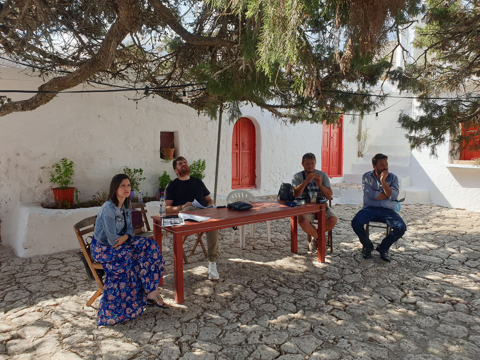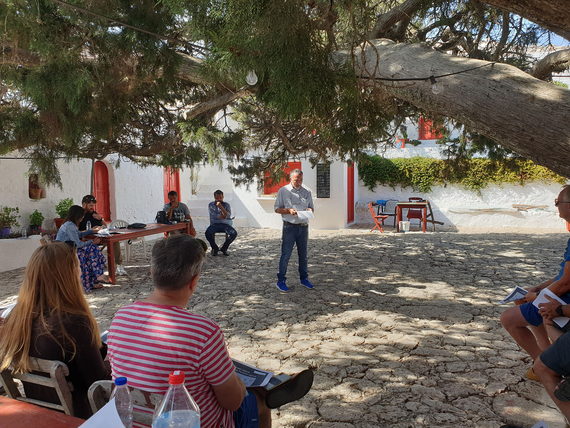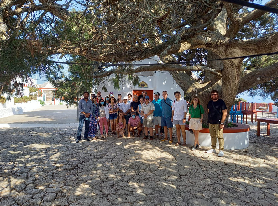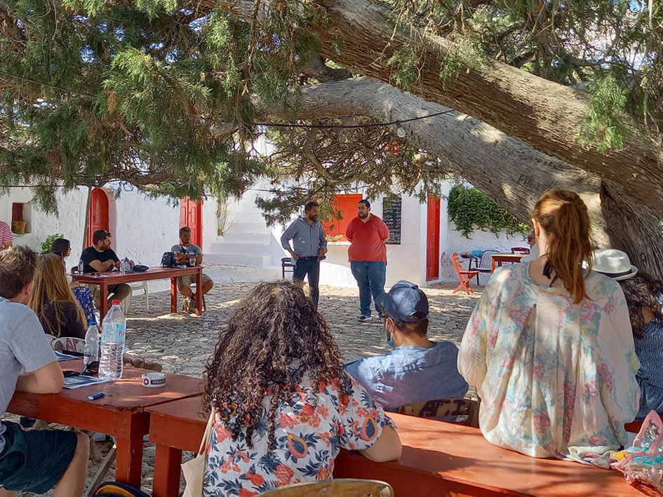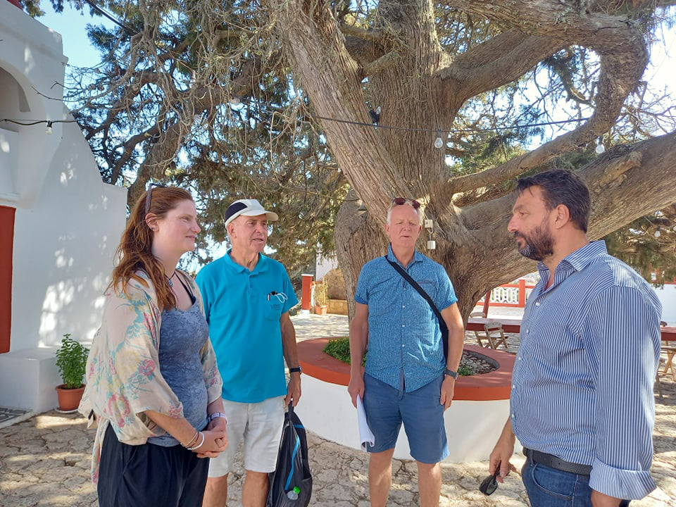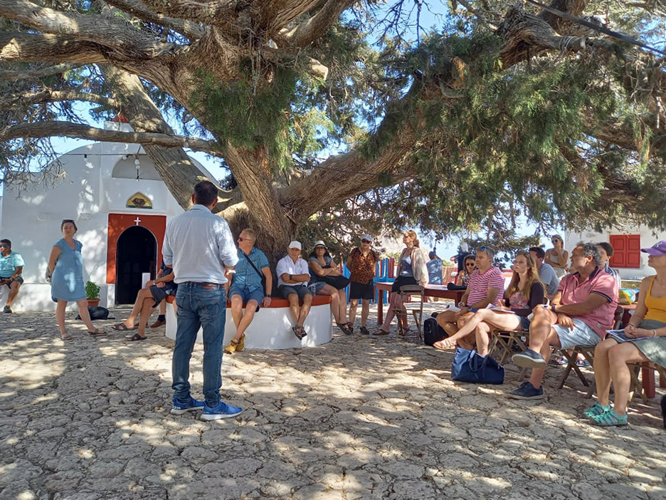 Κάτω από το 600+ ετών δέντρο, στην μοναδική αυτή τοποθεσία με την τεράστια σημασία για τη Χάλκη, ο Δήμαρχος Χάλκης και Πρόεδρος της ΑΝΔΩ, Ευάγγελος Φραγκάκης, υποδέχθηκε τους 25 συμμετέχοντες και τους μίλησε για τις βασικές αρχές της προσπάθειας που κάνει η Χάλκη για να μετατραπεί σε ένα νησί πρότυπο, ενεργειακά αυτόνομο, περιβαλλοντικά βιώσιμο, και άρα ελκυστικό για κατοίκους και επισκέπτες.
