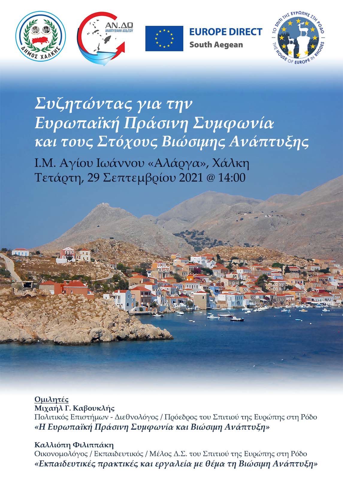 Στον μοναδικό πολιτιστικά και περιβαλλοντικά χώρο της Ιεράς Μονής του Άη Γιάννη “Αλάργα” πραγματοποιήθηκε η εκδήλωση «Συζητώντας για την Ευρωπαϊκή Πράσινη Συμφωνία και τους Στόχους Βιώσιμης Ανάπτυξης» που συνδιοργάνωσαν ο Δήμος Χάλκης, η Αναπτυξιακή Δωδεκανήσου, το Europe Direct Νοτίου Αιγαίου και το Σπίτι της Ευρώπης στη Ρόδο, την Τετάρτη, 29 Σεπτεμβρίου 2021.