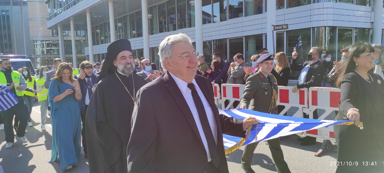Ο Γενικός Γραμματέας Απόδημου Ελληνισμού και Δημόσιας Διπλωματίας κ. Γιάννης Χρυσουλάκης, η Πρέσβης της Ελλάδας στη Γερμανία κ. Μαρία Μαρινάκη, ο Γενικός Πρόξενος της Ελλάδας στη Στουτγάρδη κ. Συμεών Λιναρδάκης, ο Στρατιωτικός Ακόλουθος κ. Ε. Κολόβης καθώς και ο Θεοφιλέστατος Επίσκοπος Αριανζού κύριος Βαρθολομαίος, συμμετείχαν στο κλείσιμο της παρέλασης και περπάτησαν μαζί προς τη βιβλιοθήκη της πόλης, κρατώντας την ελληνική σημαία απλωμένη μεταξύ τους.