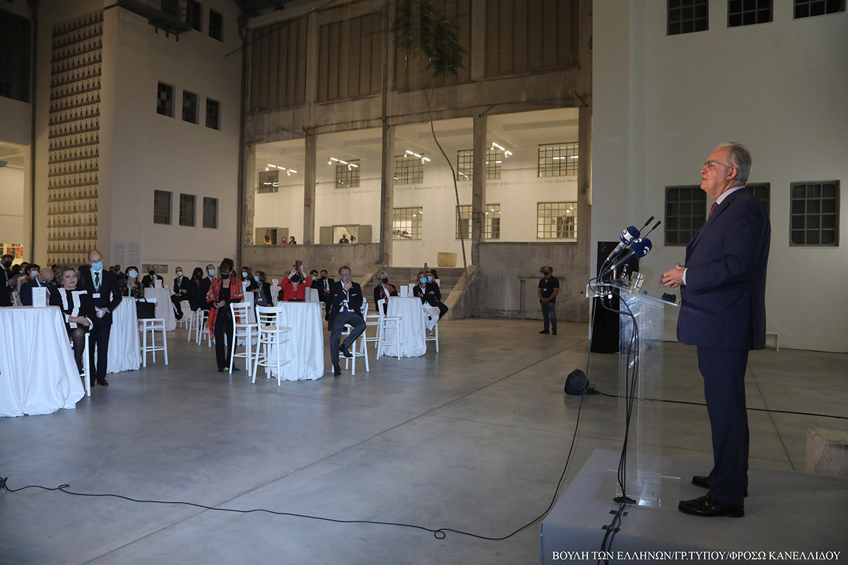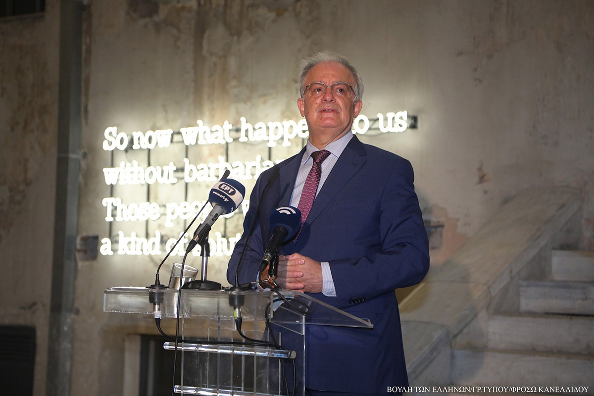 «Ξεκινάμε τη φιλοξενία μας φέρνοντάς σας σε επαφή με τη σύγχρονη τέχνη» υπογράμμισε ο κ. Τασούλας, κάνοντας ιδιαίτερη αναφορά στο κτήριο του πρώην Δημοσίου Καπνεργοστασίου που περιήλθε στην ιδιοκτησία του Ελληνικού Κοινοβουλίου πριν από περίπου είκοσι χρόνια και στην πρόσφατη συνεργασία της Βουλής με τον Πολιτιστικό Οργανισμό ΝΕΟΝ και τον ιδρυτή του κ. Δημήτρη Δασκαλόπουλο για την αξιοποίηση του κτηρίου αυτού και τη μετατροπή πολλών χώρων του σε μια αίθουσα τέχνης, όπου φιλοξενούνται έργα 59 καλλιτεχνών από όλο τον κόσμο.