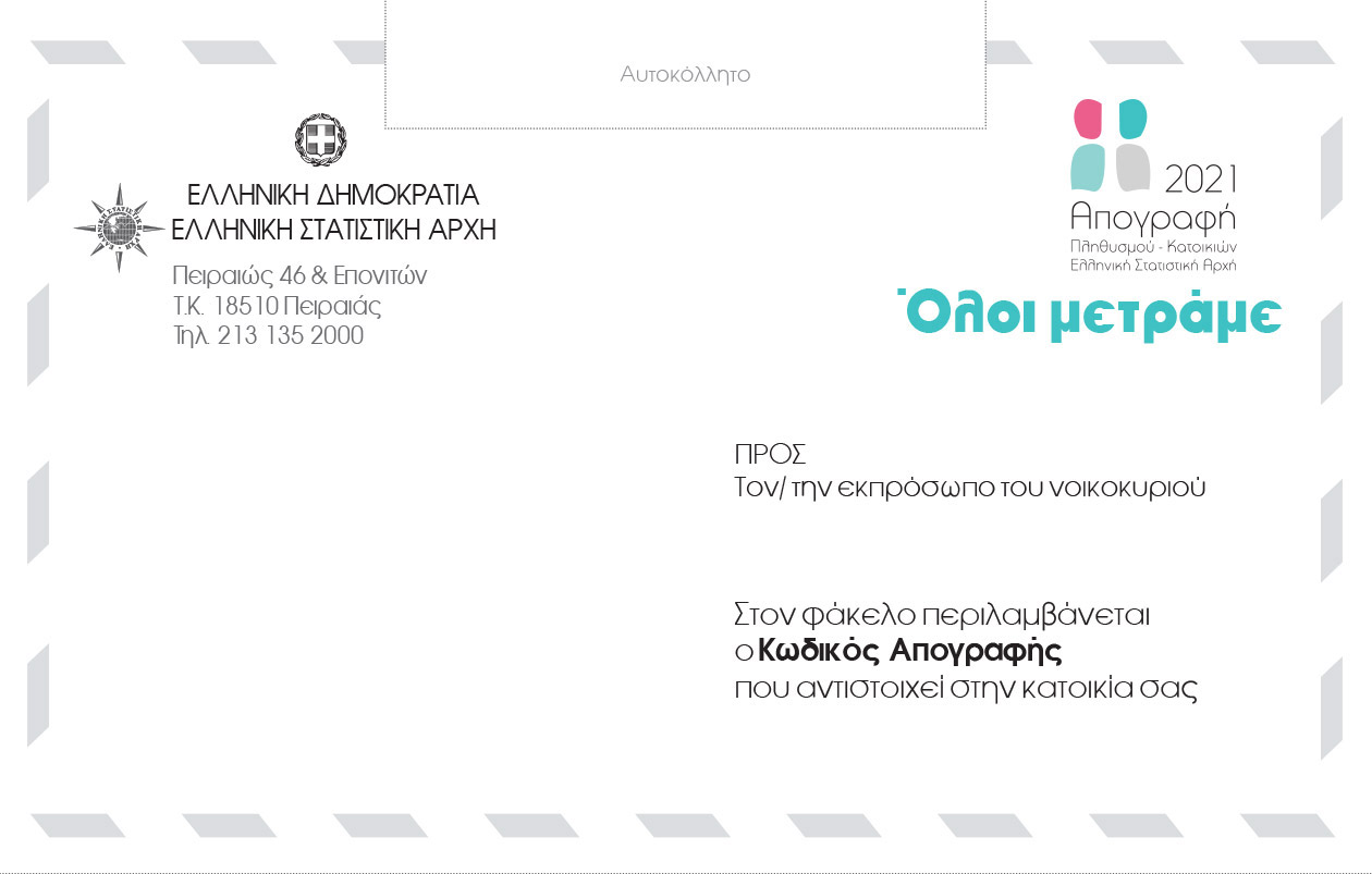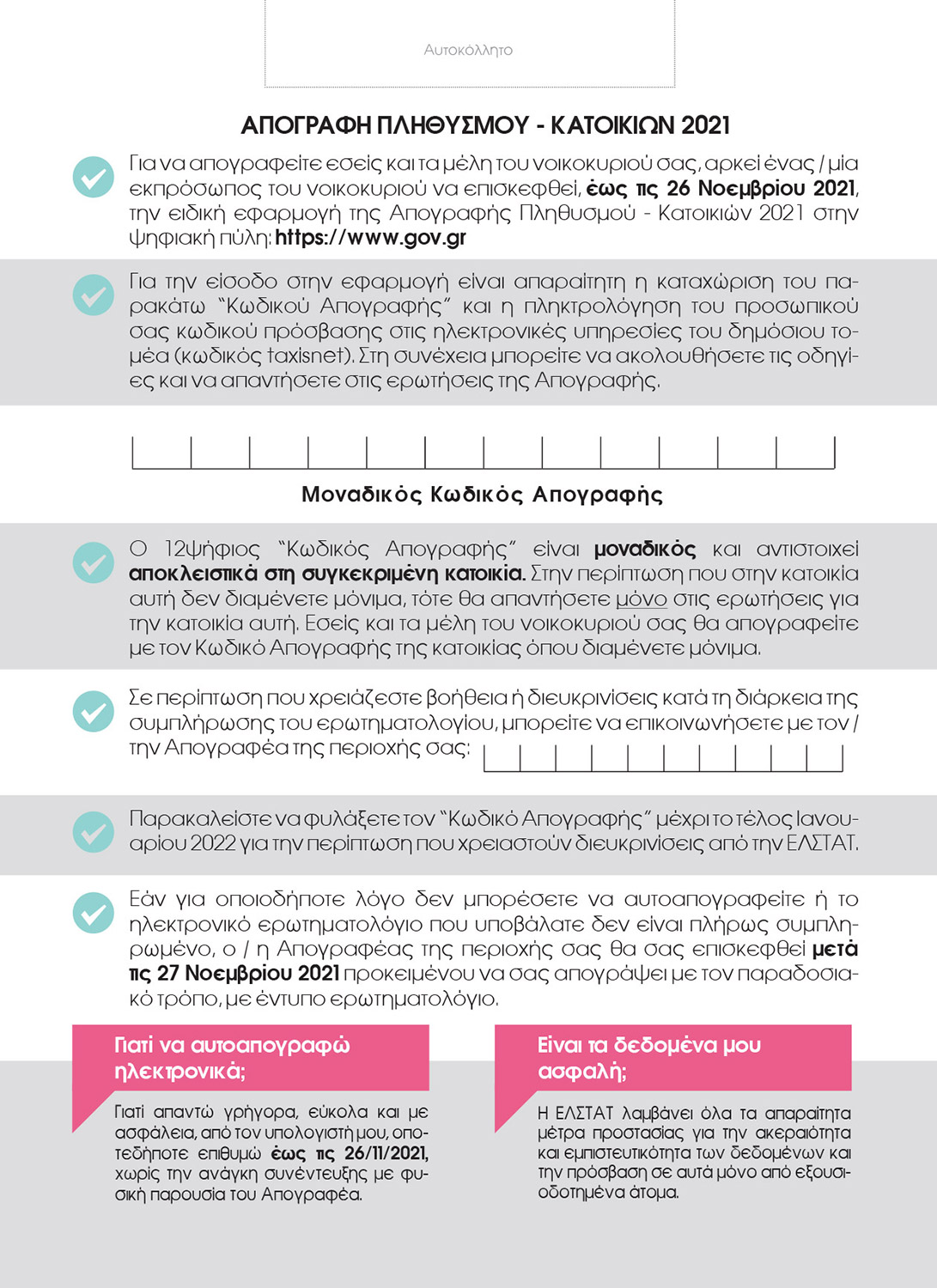 Ένας απογραφέας της ΕΛΣΤΑΤ θα εναποθέσει έναν κλειστό φάκελο σε κάθε οικία, διαμέρισμα ή άλλου είδους κατάλυμα με έναν μοναδικό κωδικό αριθμό που θα αντιστοιχεί στη συγκεκριμένη κατοικία. Στη συνέχεια, ένας εκπρόσωπος του νοικοκυριού θα μπορεί να εισέλθει στην ειδική εφαρμογή της Απογραφής, μέσω του www.gov.gr, χρησιμοποιώντας τον μοναδικό αυτόν κωδικό και τους κωδικούς taxis ώστε να συμπληρώσει το ερωτηματολόγιο για το νοικοκυριό και τα μέλη του.