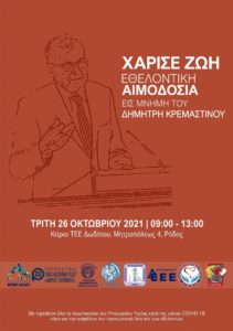 Η αιμοδοσία είναι αφιερωμένη στη μνήμη του Δημήτρη Κρεμαστινού, που υπήρξε υπέρμαχος της εθελοντικής αιμοδοσίας και συνέβαλε αποφασιστικά στην ανάπτυξη των Κέντρων Αιμοδοσίας στην Ελλάδα, αποτίοντας ελάχιστο φόρο τιμής στο πολυσήμαντο έργο του στην πολιτική και την ιατρική επιστήμη.