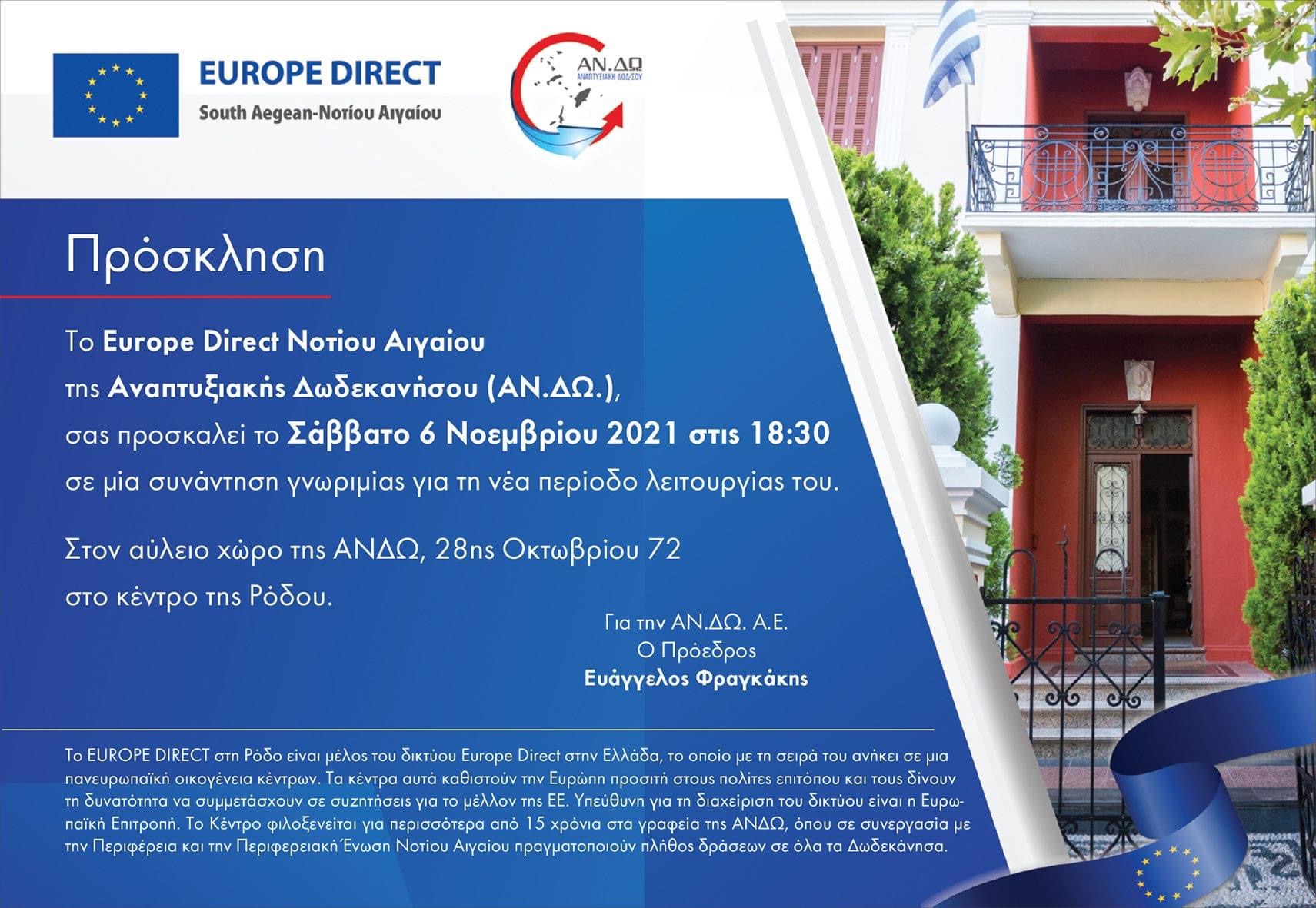 Το Europe Direct Νοτίου Αιγαίου είναι πάντα ανοιχτό, φιλόξενο και έτοιμο να συνεργαστεί με όλους όσοι σκέφτονται και ενεργούν προς όφελος της Ευρωπαϊκής Ένωσης.