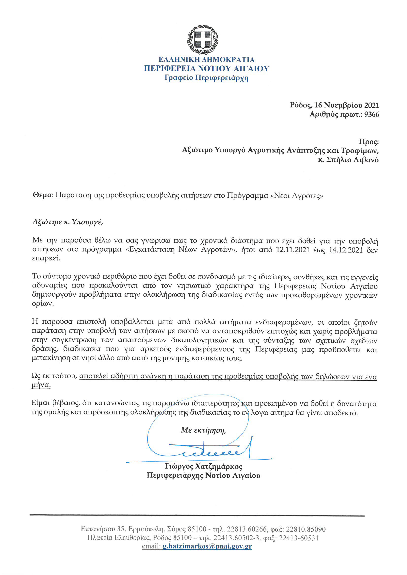 Την παράταση της προθεσμίας υποβολής αιτήσεων στο Πρόγραμμα «Εγκατάσταση Νέων Αγροτών» για ένα μήνα, ζητά ο Περιφερειάρχης Νοτίου Αιγαίου, Γιώργος Χατζημάρκος, με επιστολή που απέστειλε στον Υπουργό Αγροτικής Ανάπτυξης και Τροφίμων, Σπήλιο Λιβανό.