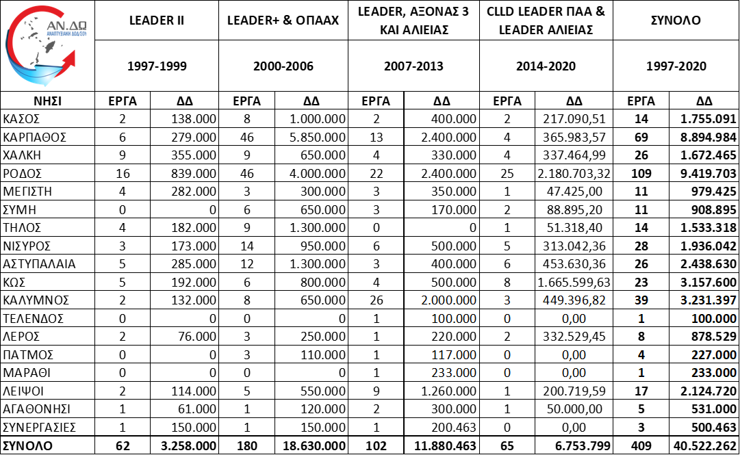 Δεν πρέπει να ξεχνάμε «εμβληματικές επενδύσεις» στα νησιά μας, όπως είναι τα οινοποιεία στους Λειψούς, στην Πάτμο, οι αποκαταστάσεις μνημείων αγροτικής κληρονομιάς στα χωριά και στα νησιά μας (π.χ. μάγγανο Λαχανιάς, μύλος στην Όλυμπο), το τυροκομείο στην Κάλυμνο ή και οι υπό κατασκευή μονάδες παραγωγής ξυδιού και χυμού ροδιού στη Ρόδο, το πρώτο οινοποιείο στην Κάρπαθο και άλλα πολλά τα οποία υλοποιήθηκαν με τη βοήθεια της ΑΝΔΩ και του προγράμματος LEADER.