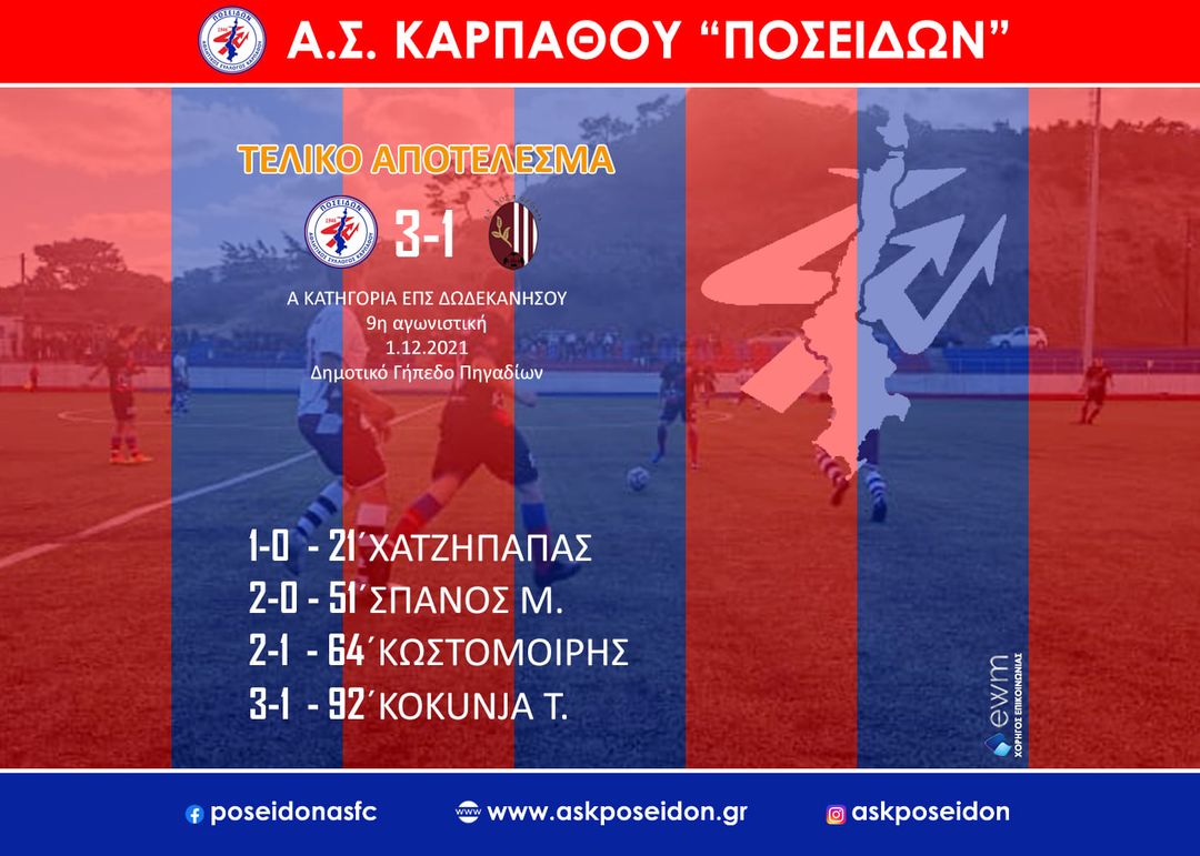 Την δεύτερη συνεχόμενη και τέταρτη συνολικά νίκη πήρε ο “Ποσειδώνας” Καρπάθου απέναντι στην “Δόξα” Ψίνθου στα πλαίσια της 9ης αγωνιστικής του πρωταθλήματος Α’ κατηγορίας ΕΠΣ Δωδεκανήσου 2021-22.