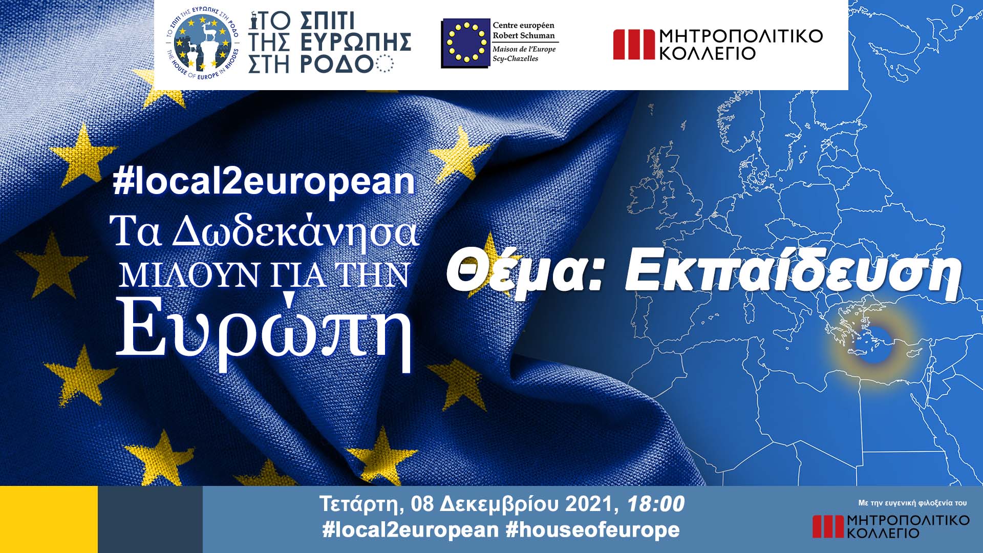 Το Σπίτι της Ευρώπης στη Ρόδο, το Ευρωπαϊκό Κέντρο Ρομπέρ Σουμάν (Γαλλία) και το Μητροπολιτικό Κολλέγιο στη Ρόδο, διοργανώνουν, την τρίτη εκδήλωση «#local2european | Τα Δωδεκάνησα μιλούν για την Ευρώπη» με θέμα την Εκπαίδευση|Τετάρτη 8 Δεκεμβρίου 2021.