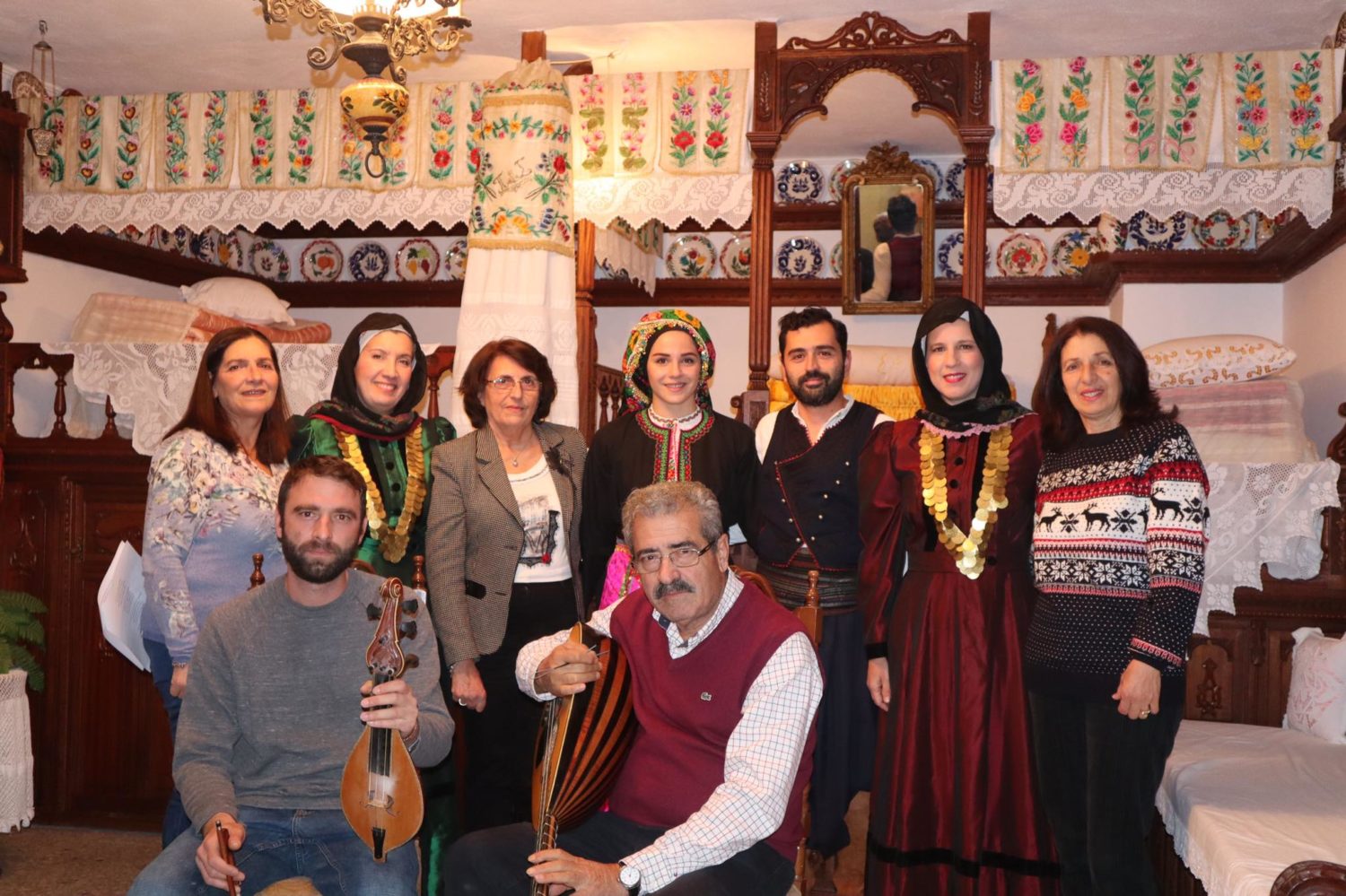 Μανώλης Μάλτας λαούτο Γιώργος Μάλτας λύρα. Από αριστερά: Φανή Αναστασιάδη, Τζίνα Λυριστή, Πόπη Διακαντώνη, Μαρία Σισαμή, Μανώλης Ματθαίος, Ανθούλα Κουρουμπλάκη, Σοφία Αναστασιάδη