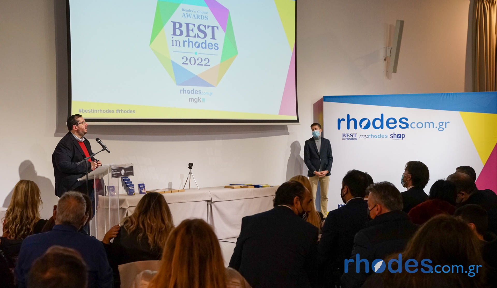 Τέλος, παρουσιάστηκαν τα Βραβεία Best in Rhodes 2022. Στόχος των διοργανωτών είναι οι επτά ψηφοφορίες να ολοκληρωθούν το πρώτο εξάμηνο του έτους και τα βραβεία να απονεμηθούν σε μία πανηγυρική εκδήλωση τον Ιούνιο, με ταυτόχρονη παρουσίαση και κυκλοφορία του δεύτερου τεύχους του Επίσημου Οδηγού. Η βραδιά έκλεισε με μία «νόστιμη» δεξίωση από το Playcafe Catering. Τα κρασιά ήταν προσφορά της Tatakis Wines.
