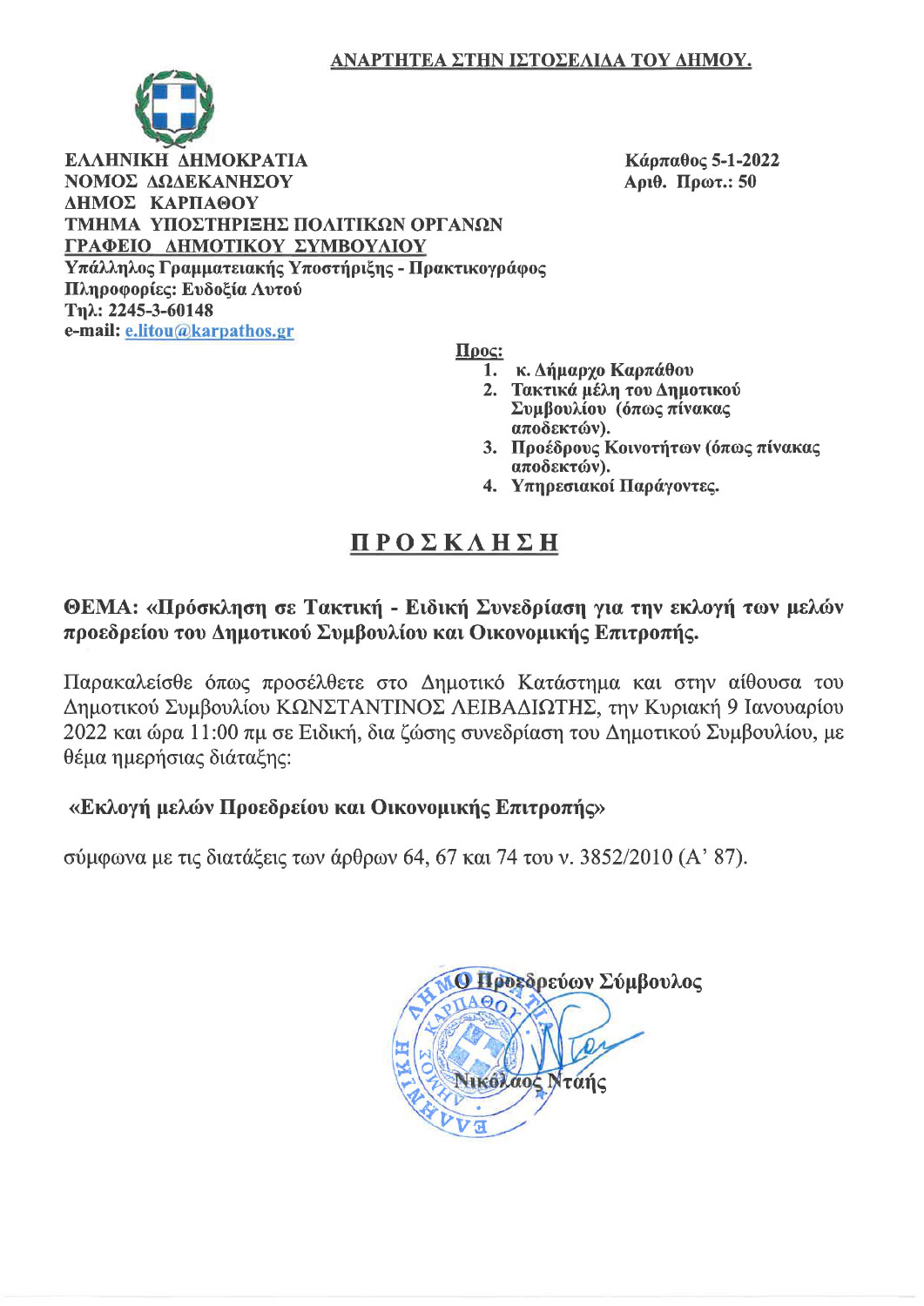 Στις 9/1/2022 ημέρα Κυριακή και ώρα 11:00 π.μ θα πραγματοποιηθεί συνεδρίαση στο Δήμο Kαρπάυου, δια ζώσης για την εκλογή Μελών Προεδρείου και Οικονομικής Επιτροπής.