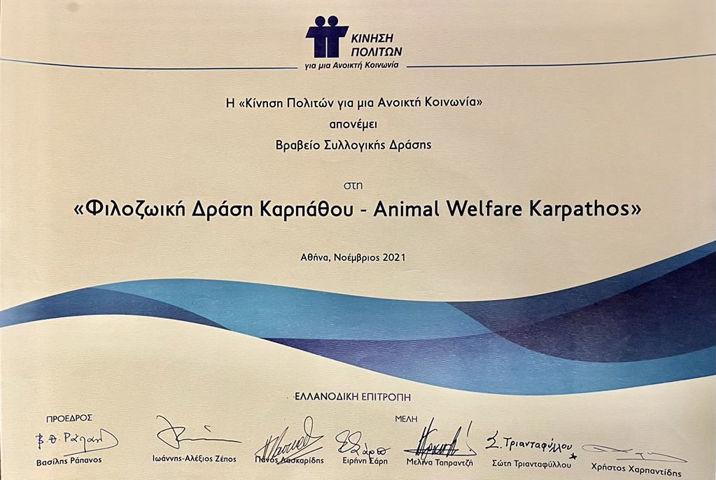 An award ceremony sponsored by the organization “Kinisi Politon (Citizen’s Movement)” was held, on December 9, 2021, in the Old Parliament in Athens. Among the 7 non-profit organizations selected to receive an award in recognition of their contributions to society, was Animal Welfare Karpathos (AWK).