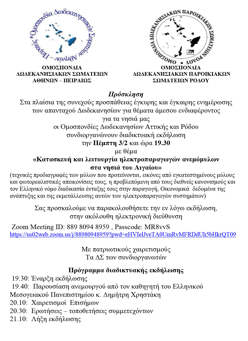 Πέμπτη 3/2, 7.30μμ: Διαδικτυακή παρουσίαση ηλεκτροπαραγωγού ανεμόμυλου (ανεμουργού) από καθηγητή κ. Δ. Χρηστάκη του Ελληνικού Μεσογειακού Πανεπιστημίου.