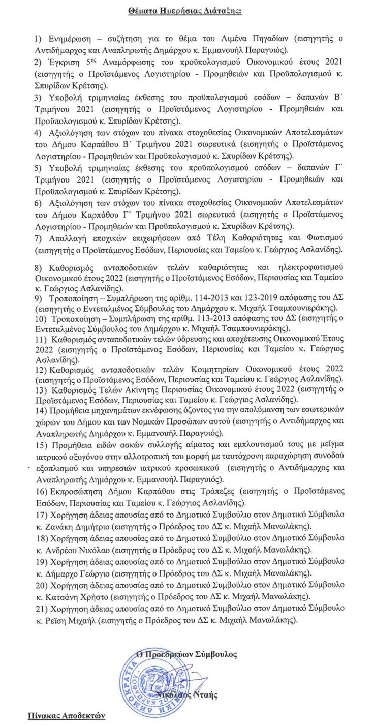 Τη Δευτέρα 7 Φεβρουαρίου 2022 και ώρα 18:00 πραγματοποιήθηκε η 3η Επαναληπτική Συνεδρίαση του Δ.Σ του Δήμου Καρπάθου.