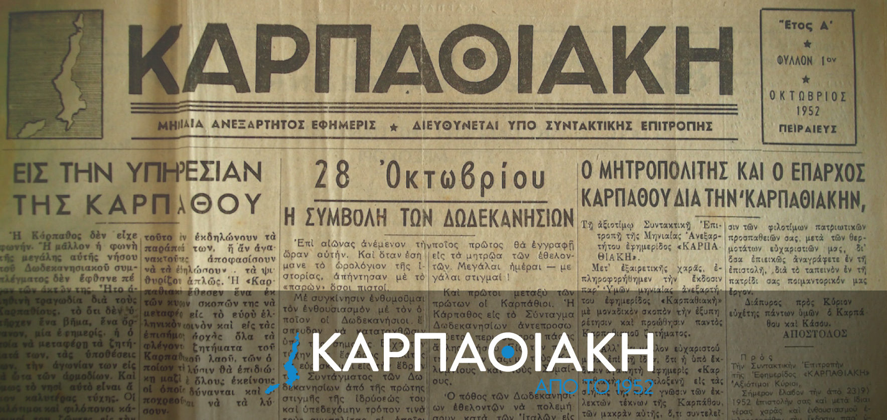 «Η Εφημερίδα “ΚΑΡΠΑΘΙΑΚΗ” υπηρετεί για εξήντα εννέα (69) χρόνια και πλέον τους ανά την γη Καρπάθιους παρέχοντας σ’ αυτούς άμεση και υπεύθυνη πληροφόρηση.