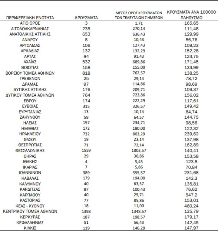 Με βάση τα επιβεβαιωμένα κρούσματα των τελευταίων 7 ημερών, 313 θεωρούνται σχετιζόμενα με ταξίδι από το εξωτερικό και 2.232 είναι σχετιζόμενα με ήδη γνωστό κρούσμα.