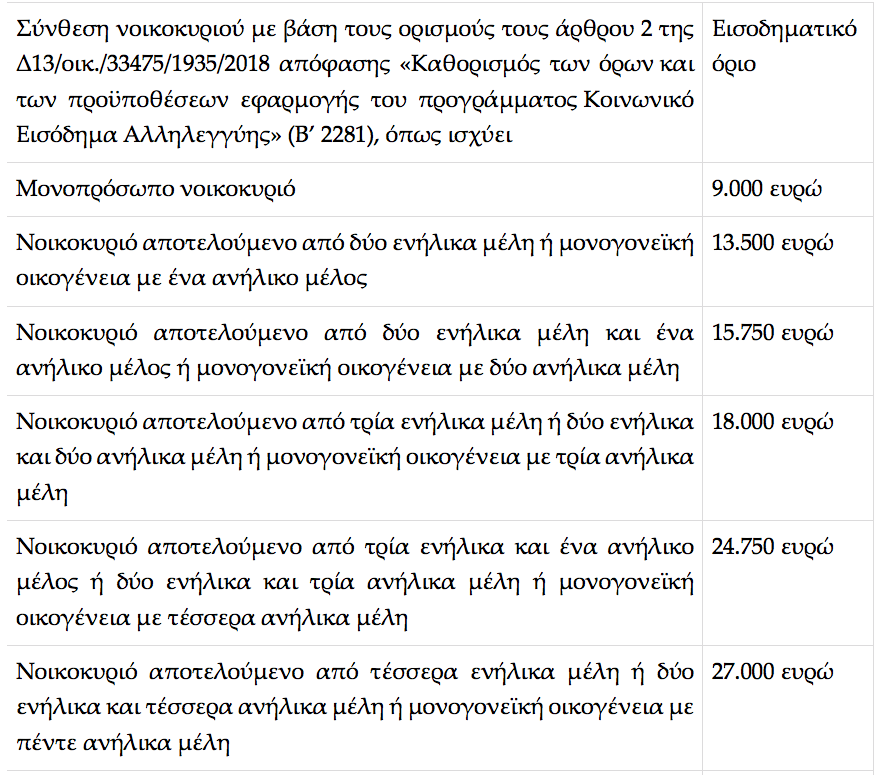 Να έχουν οι ίδιοι και τα μέλη του νοικοκυριού τους, με βάση τους ορισμούς τους άρθρου 2 της Δ13/οικ./33475/1935/2018 απόφασης «Καθορισμός των όρων και των προϋποθέσεων εφαρμογής του προγράμματος Κοινωνικό Εισόδημα Αλληλεγγύης» (Β’ 2281), όπως ισχύει, ετήσιο συνολικό πραγματικό (φορολογητέο, αυτοτελώς φορολογούμενο ή ειδικώς φορολογούμενο ή απαλλασσόμενο φόρου) ή τεκμαρτό εισόδημα, όπως αυτό προκύπτει από τις τελευταίες εκκαθαρισμένες δηλώσεις φόρου εισοδήματος των μελών του νοικοκυριού για τις οποίες έχει λήξει η οριζόμενη από τις κείμενες διατάξεις ή η παραταθείσα με οποιονδήποτε τρόπο προθεσμία υποβολής, με την επιφύλαξη προσκόμισης των δικαιολογητικών μεταβολής οποιουδήποτε εισοδηματικού ή περιουσιακού στοιχείου ή σύνθεσης νοικοκυριού, όπως αυτά προβλέπονται στο άρθρο 3, έως τα όρια του παρακάτω πίνακα: