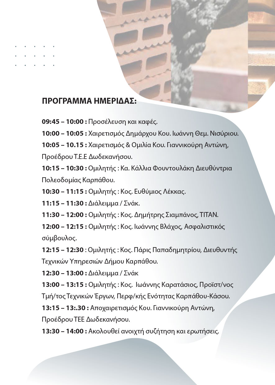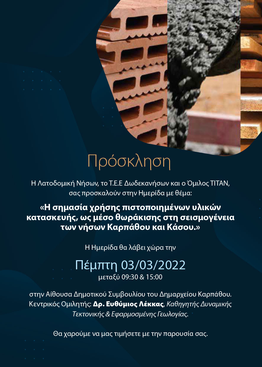 Διοργανώνεται την Πέμπτη 03/03/2022, από την Λατοδομική Νήσων, υπό την αιγίδα του Τ.Ε.Ε Δωδεκανήσων και σε συνεργασία με τον Όμιλο ΤΙΤΑΝ, ημερίδα με θέμα : Η σημασία χρήσης πιστοποιημένων υλικών κατασκευής, ως μέσο θωράκισης στην σεισμογένεια των νήσων Καρπάθου και Κάσου.