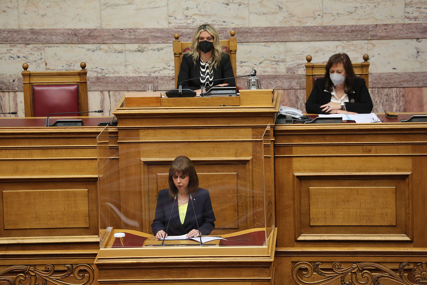 Η Πρόεδρος της Δημοκρατίας συνέχισε τονίζοντας: «Μια λιτανεία από ξεριζωμένες μητέρες, κόρες, αδελφές, διασχίζει σήμερα την Ανατολική Ευρώπη, φτάνει στις πύλες εισόδου της Πολωνίας, της Ρουμανίας, της Ουγγαρίας, της Τσεχίας, της Σλοβακίας, της Μολδαβίας, ζητά βοήθεια. Και αναμοχλεύει οδυνηρές μνήμες της δικής μας ιστορίας, της δικής μας προσφυγιάς. Την τραγωδία του 1922, το δράμα της Κύπρου». Μετά από μια ιστορική αναδρομή των αγώνων των γυναικών στη χώρα μας η κυρία Σακελλαροπούλου υπογράμμισε: «Στη δύσκολη αυτή καμπή της παγκόσμιας ιστορίας, όπου τα πάντα είναι ρευστά, ο πόλεμος είναι παρών, οι κοινωνίες μας βιώνουν μια πολυδιάστατη κρίση με άδηλη έκβαση, η θέση της γυναίκας, παρά τα σημαντικά βήματα που έχουν γίνει για την πλήρη και ίση άσκηση των δικαιωμάτων της, συχνά ολισθαίνει προς τα πίσω. Η έξαρση της έμφυλης βίας, η επιμονή των στερεοτύπων, οι εργασιακές δυσκολίες, η διάχυτη και πολύμορφη ανασφάλεια την εξουθενώνουν. Οι γυναικοκτονίες αυξάνονται, ρίχνοντας βαριά σκιά στον κοινωνικό μας βίο. Πλάι, ωστόσο, σε όλα αυτά, ή μάλλον σε πείσμα όλων αυτών, οι γυναίκες της πατρίδας μας αγωνίζονται καθημερινά για να ανταποκριθούν στους πολλαπλούς τους ρόλους, να ανατρέψουν τις διακρίσεις και τις ανισότητες, να αναπτυχθούν με ελευθερία και αυτονομία».