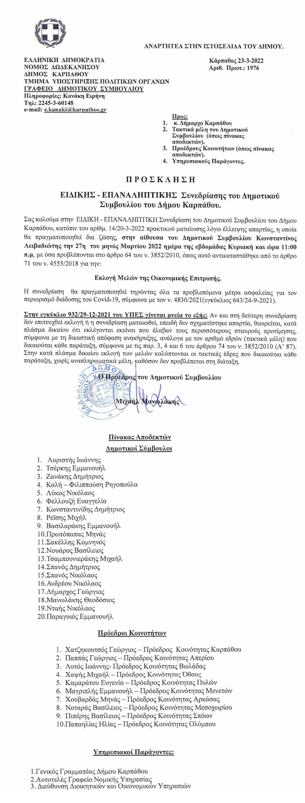 Στις 27 Μαρτίου 2022 και ώρα 11:00 π.μ., θα πραγματοποιηθεί ΕΙΔΙΚΗ ΕΠΑΝΑΛΗΠΤΙΚΗ συνεδρίαση του Δ.Σ του Δήμου Καρπάθου για την Eκλογή Μελών της Οικονομικής Επιτροπής.