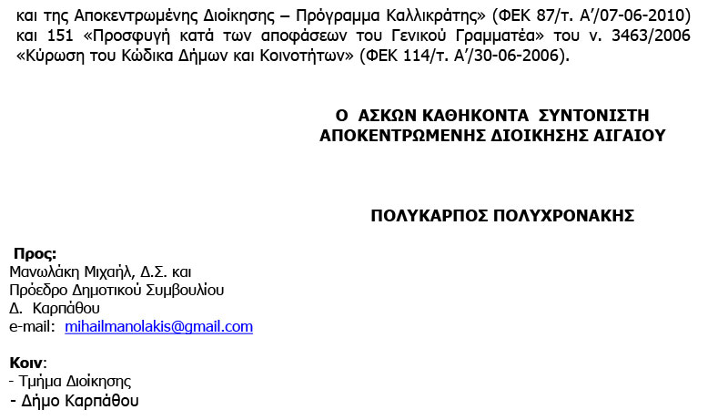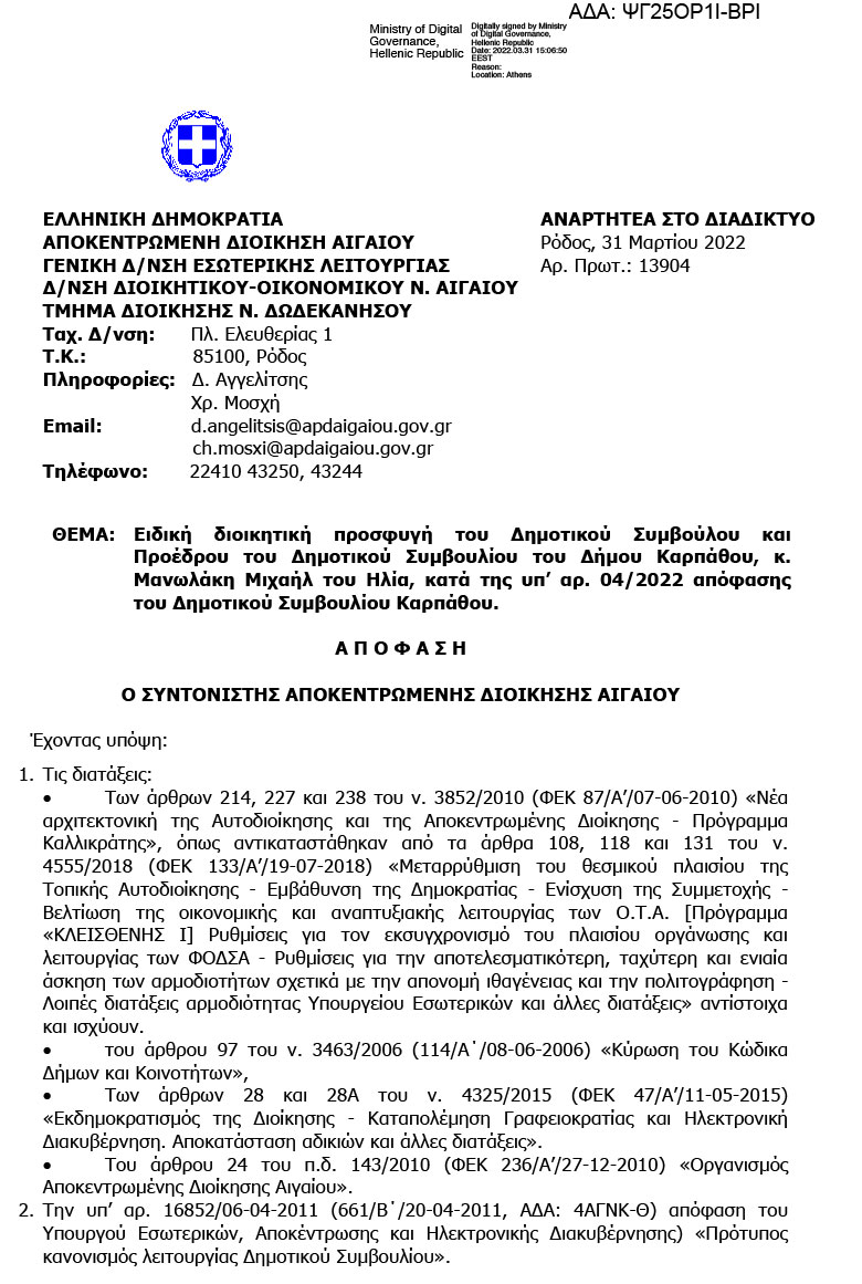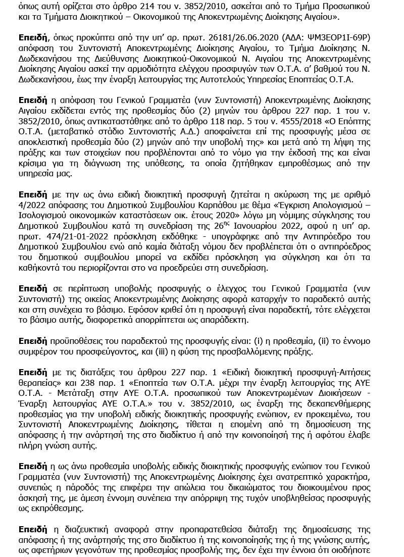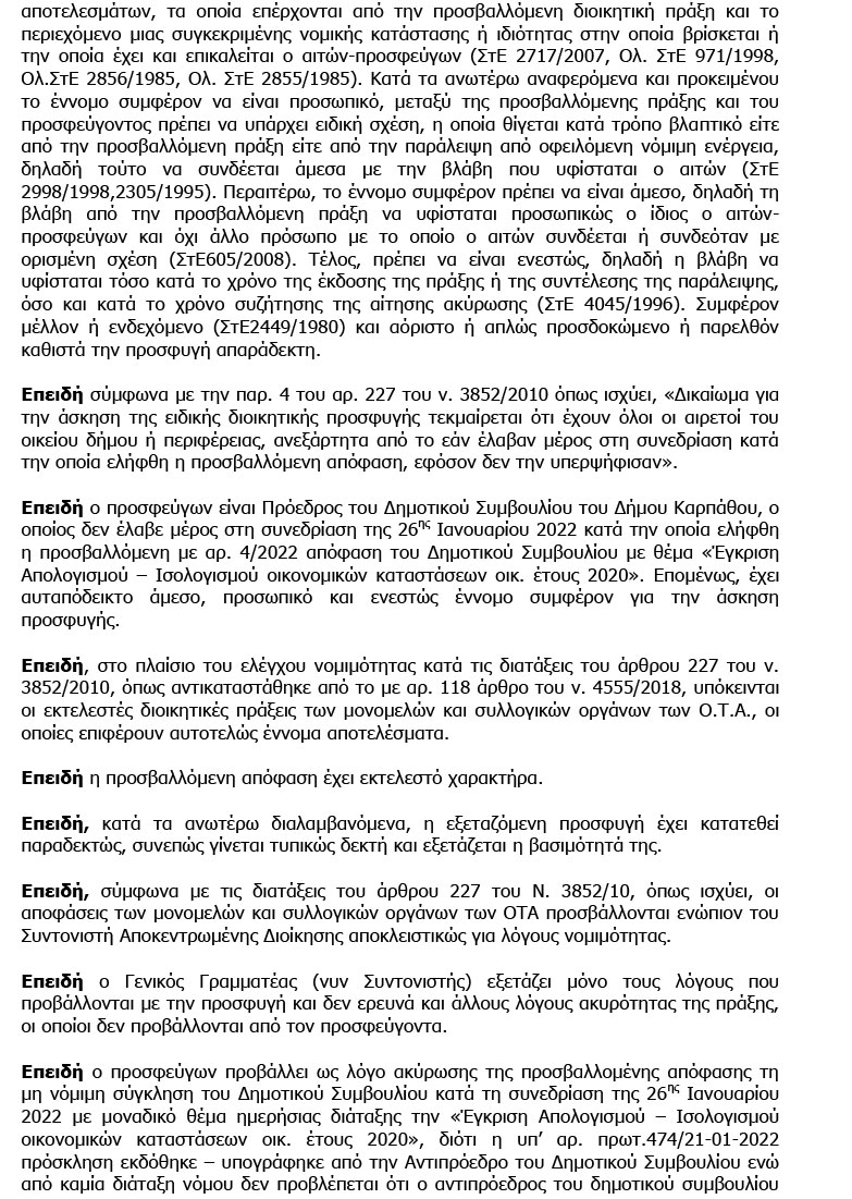 Ο πρόεδρος του Δημοτικού Συμβουλίου του Δήμου Καρπάθου Μιχάλης Ηλία Μανωλάκης προσέφυγε στην Αποκεντρωμένη Διοίκηση Aιγαίου για την ακύρωση της υπ’αρ. 4/2022 απόφαση του Δημοτικού συμβουλίου Καρπάθου με θέμα “Έγκριση Απολογισμού-Ισολογισμού οικονομικών καταστάσεων οικ.έτους 2020”,