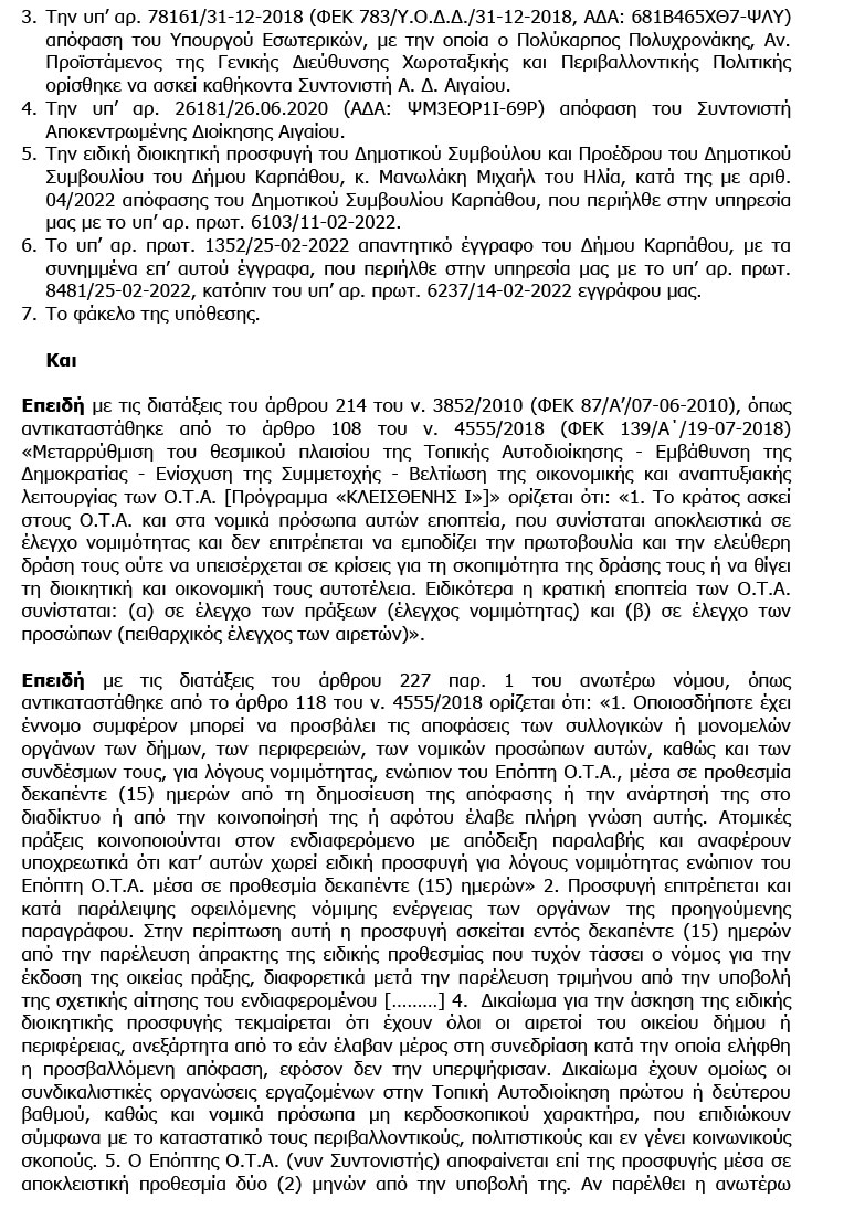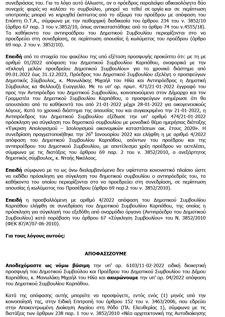 Αποδεχόμαστε ως νόμω βάσιμη την υπ. αρ.6103/11-02- 2022 ειδική διοικητική προσφυγή του Δημοτικού Συμβούλου και Προέδρου του Δημοτικού Συμβουλίου του Δήμου Καρπάθου, κ. Μανωλάκη Μιχαήλ του Ηλία και ακυρώνουμε τη υπ.αρ. 04/2022 απόφαση του Δημοτικού Συμβουλίου Καρπάθου.