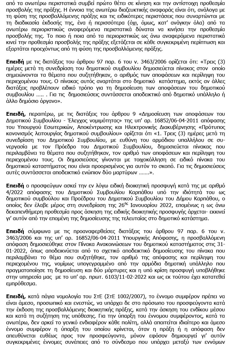 Επειδή ο προσφεύγων είναι πρόεδρος του Δ.Σ του Δήμου Καρπάθου, ο οποίος δεν έλαβε μέρος στη συνεδρίαση της 26 Ιανουαρίου 2022, κατά την οποία ελήφθη η προσβαλόμενη με αρ, απόφαση του Δ.Σ. έχει αυταπόδεκτο άμεσο, προσωπικό και ενεστώς έννομο συμφέρον για την άσκηση προσφυγής.