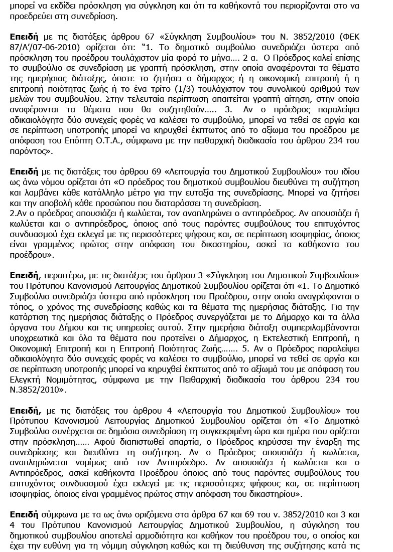 λόγω μη νόμιμης συγκλησης του Δημοτικού Συμβουλίου κατά την συνεδρίαση της 26 Ιανουρίου 2022, αφού η υπ’αρ. πρωτ. 474/21-01-2022 πρόσκληση εκδόθηκε-υπογράφηκε από την Aντιπρόεδρο του Δημοτικού Συμβουλίου ενώ από καμία διάταξη του νόμου δεν προβλέπεται ότι ο αντιπρόεδρος του Δημοτικού Συμβουλίου μπορεί να εκδίδει πρόσκληση για σύγκληση και ότι τα καθήκοντα του περιορίζονται στο να προεδρεύει στην Συνεδρίαση.
