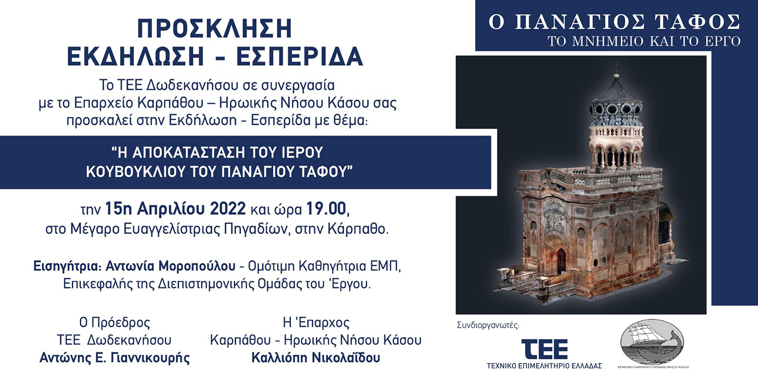 Το ΤΕΕ Δωδεκανήσου σε συνεργασία με το Eπαρχείο Καρπάθου-Ηρωικής Νήσου Καρπάθου πραγματοποιεί εκδήλωση με θέμα “Η Αποκατάσταση του Ιερού Κουβουκλίου του Παναγίου Τάφου” στις 15 Απριλίο 2022 και ώρα 19:00 στο Μέγαρο Ευαγγελιστρίας Πηγαδίων ,στην Κάρπαθο.